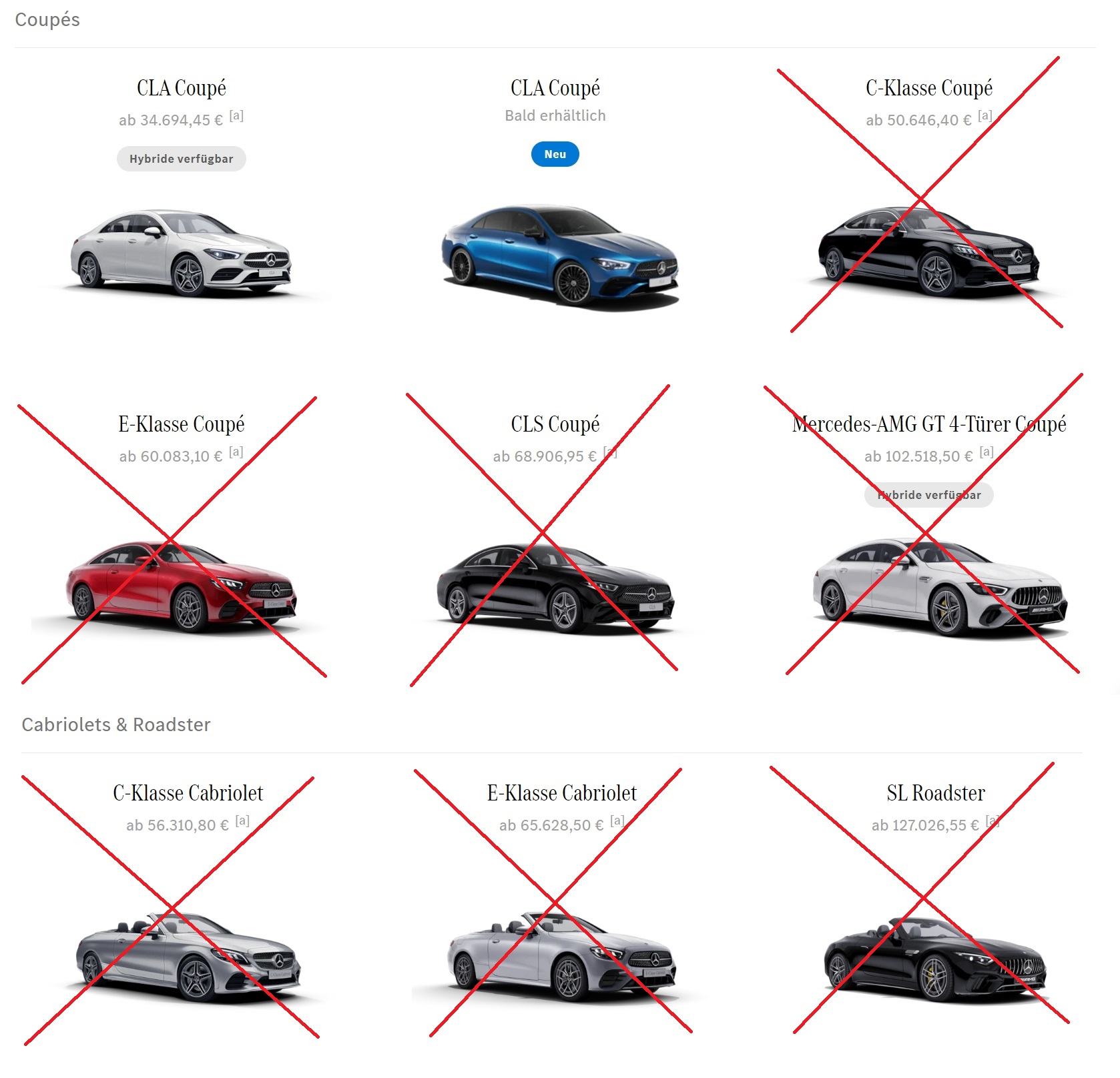 사실, CLS만 단종되는 것이 아닌, 벤츠의 대부분의 쿠페와 카브리올레 모델이 단종됩니다.
