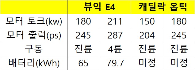 뷰익 일렉트라 E4와 캐딜락 옵틱의 스펙입니다.