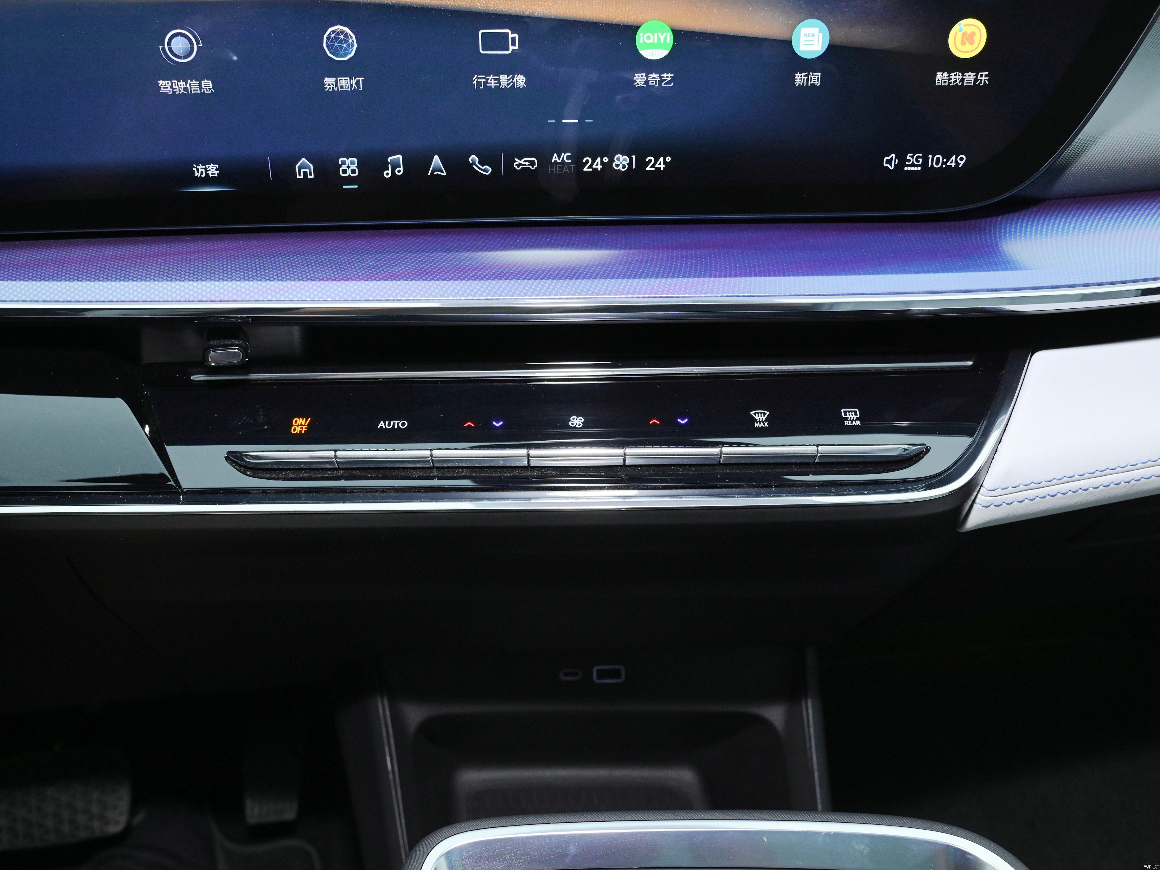 공조기 조절 기능 대부분을 30인치 인포테인먼트 모니터에서 하기 때문에, 필수적인 버튼 몇 가지만 물리 버튼으로 배치하였습니다.