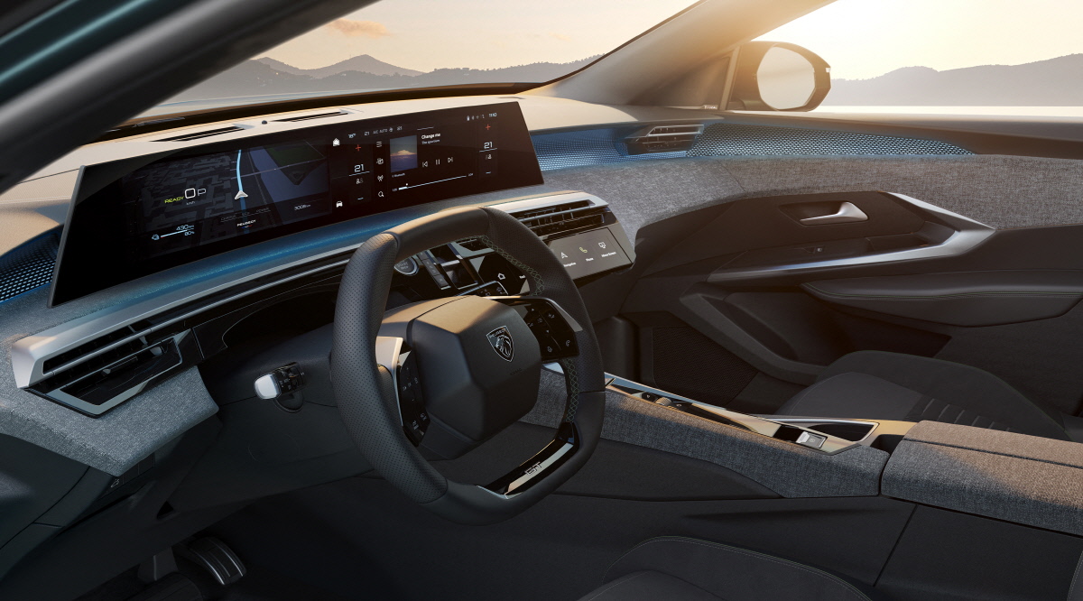 푸조가 평소에 즐겨 사용하는 작은 스티어링 휠과 아이콕피트에, 21인치 HD 모니터를 조화롭게 배치한 것이 특징입니다.
