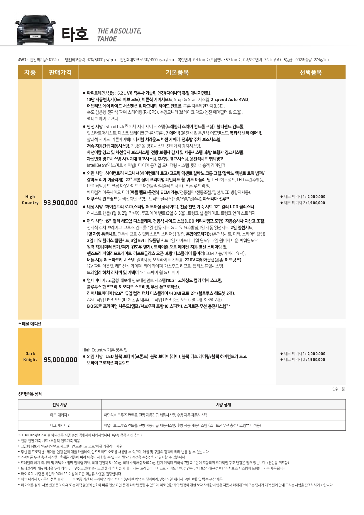 일반적으로 국내에 판매 혹은 수입되는 쉐보레 차량들은 LS, LT, 프리미어, RS 등등 다양한 트림을 판매하지만, 타호는 하이 컨트리와 다크나이트 에디션, 두 가지만을 판매하고 있습니다.