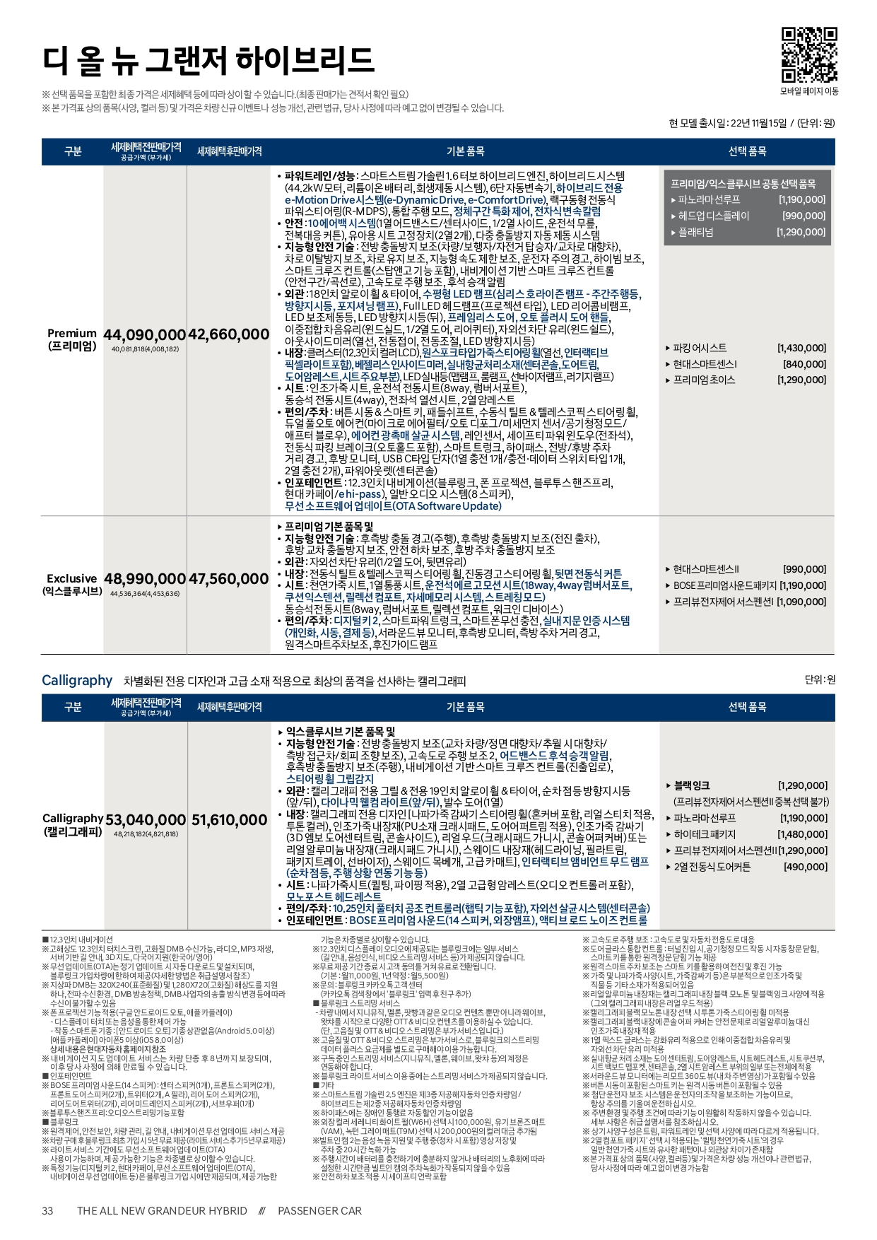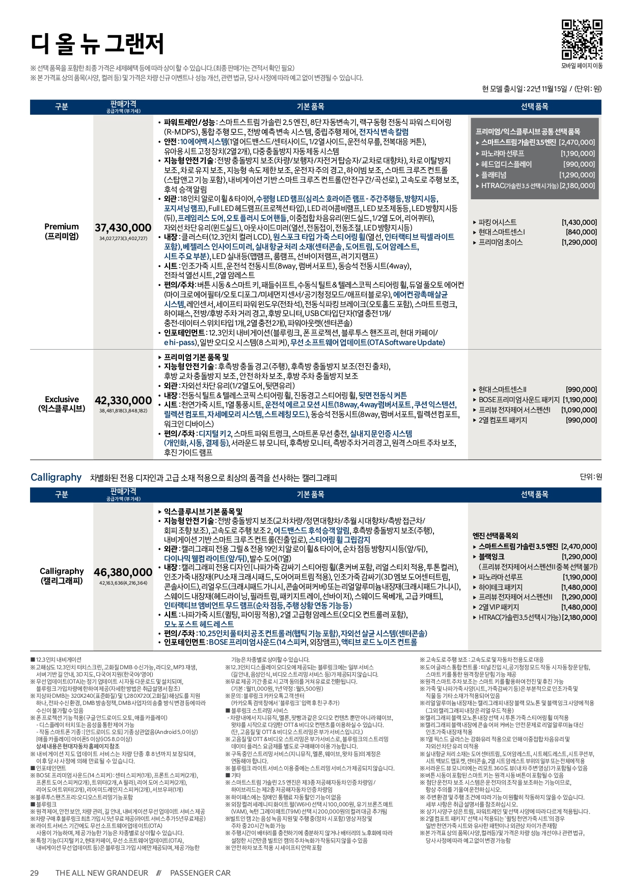 트림은 크게 프리미엄과 익스클루시브, 캘리그래피 트림 세 가지로 이루어져 있고, 다양한 선택품목이 존재합니다.