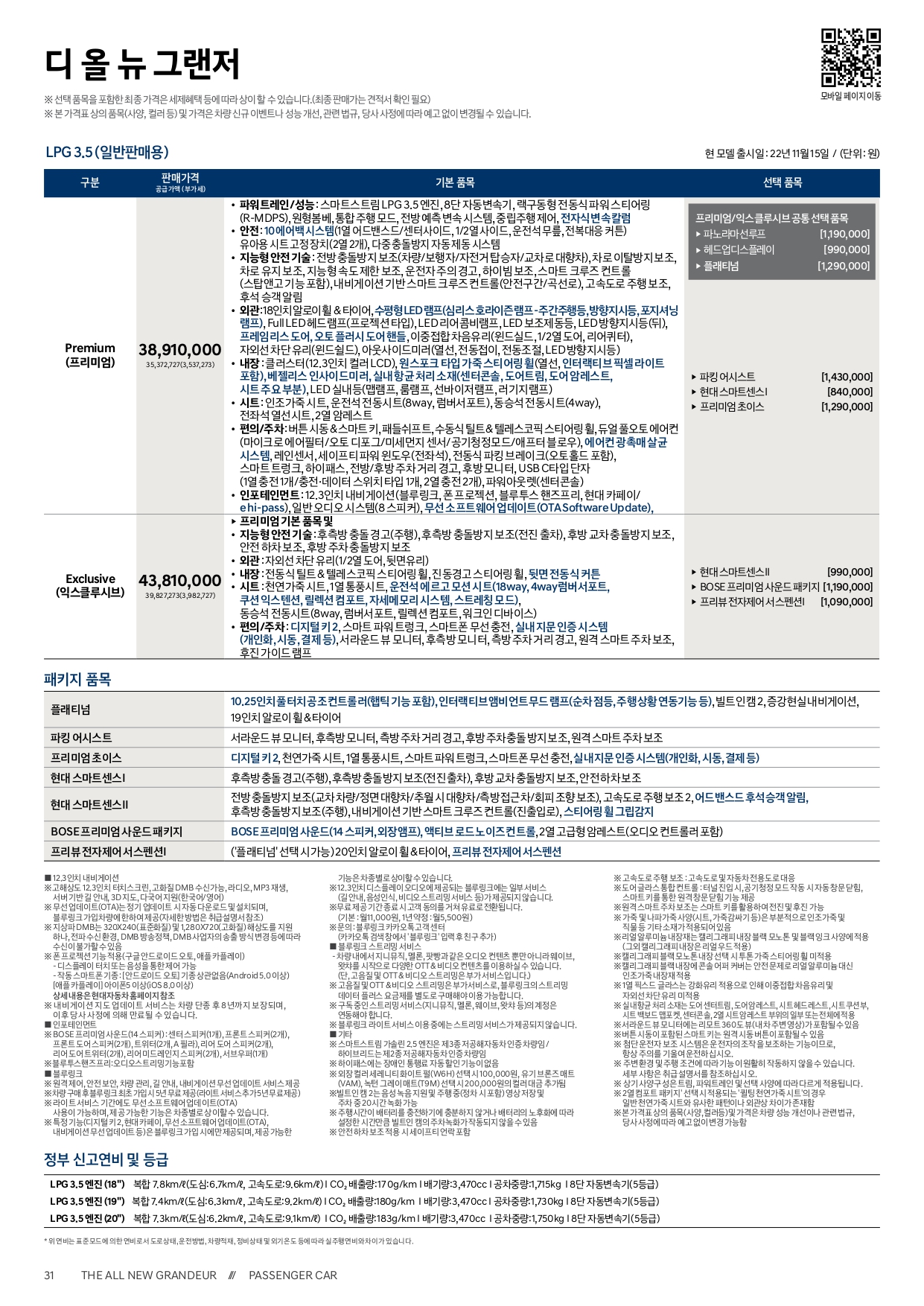 또, 가격표 보시기 전에 다른 팁 하나 공유드리면, 고급 트림인 캘리그래피와 블랙잉크 에디션은 가솔린 및 하이브리드 트림에서만 선택 가능하고, LPG 트림에서는 선택이 불가합니다.