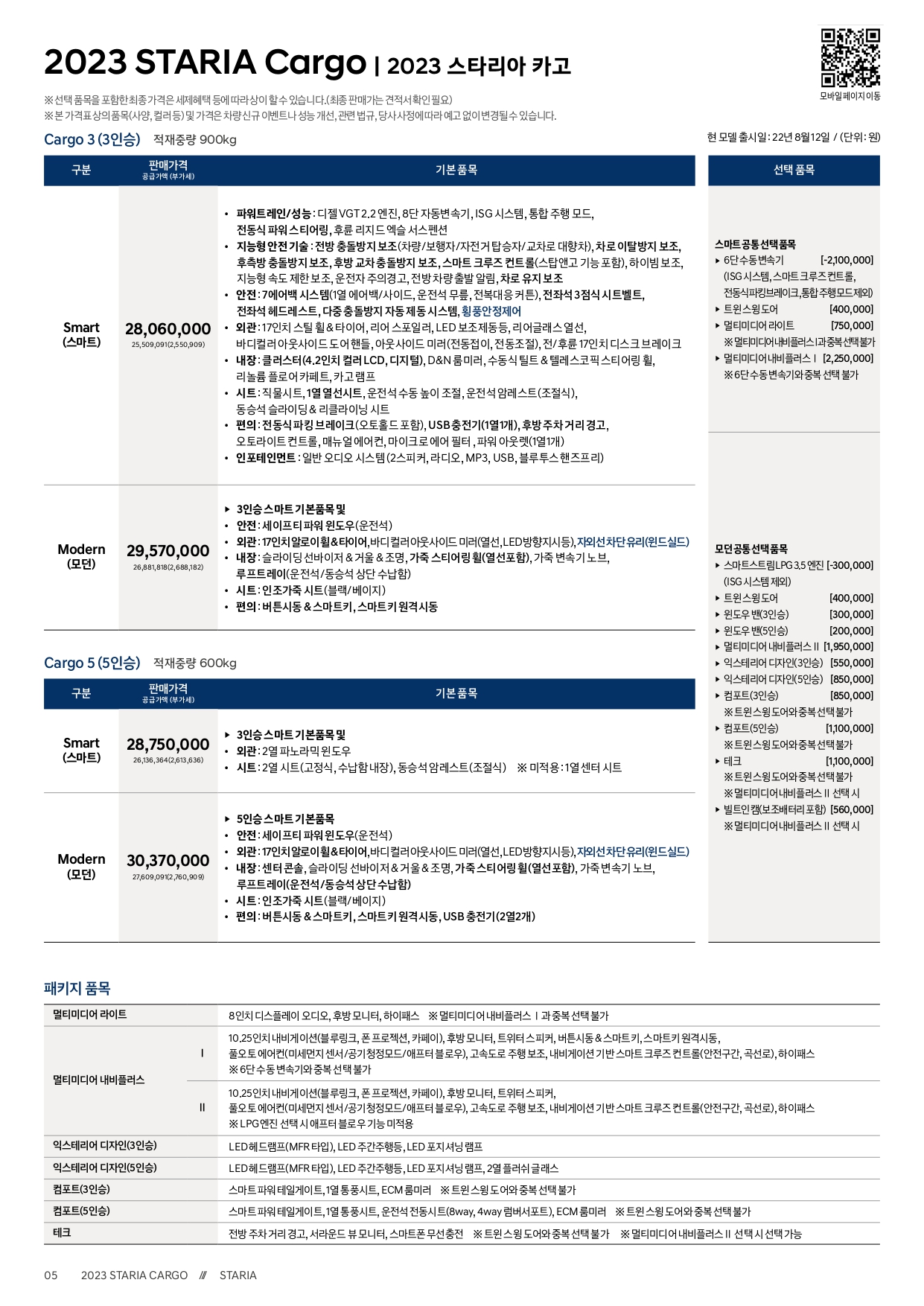 3인승 및 5인승 모두 트림운영은 스마트와 모던, 두 가지로 나옵니다.