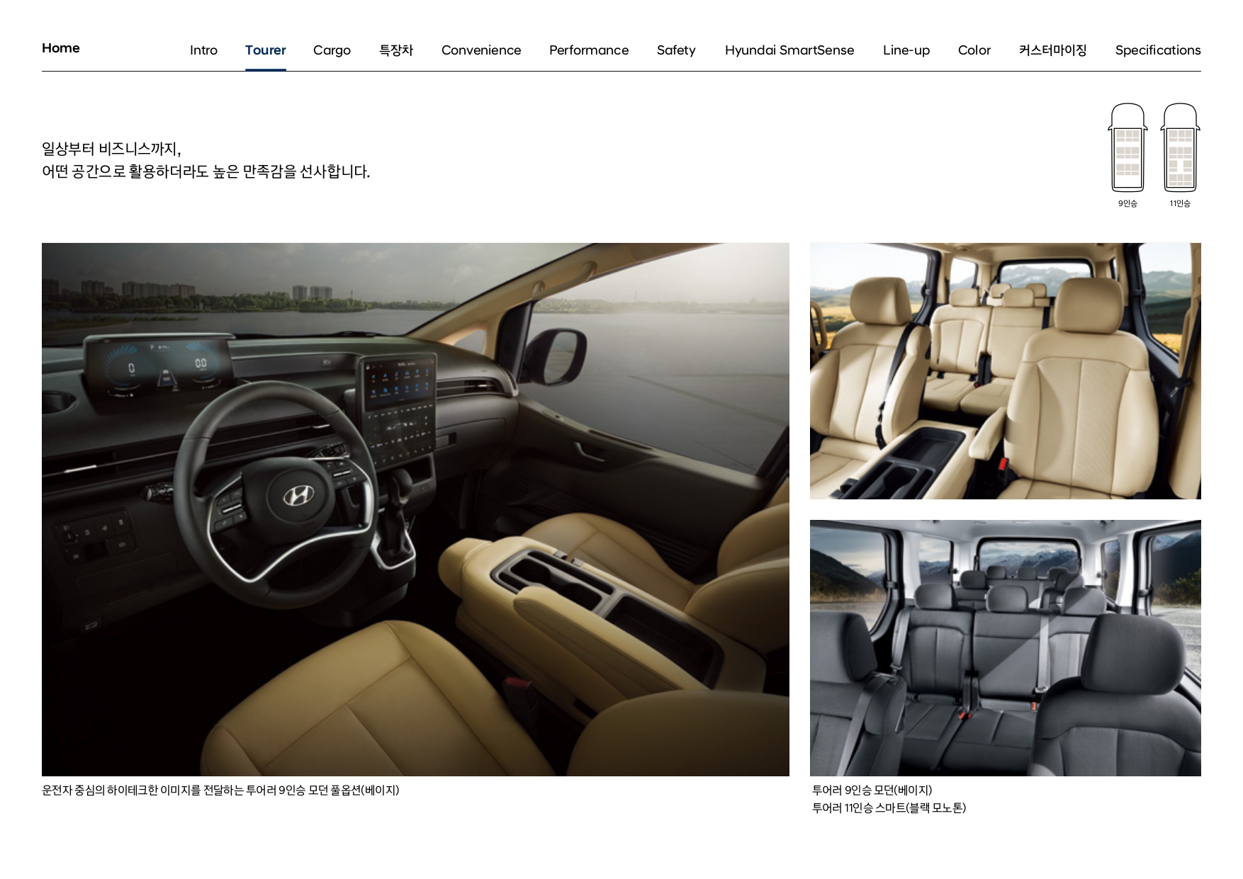 투어러 사양의 경우, 11인승과 9인승 모델 두 가지가 있습니다.