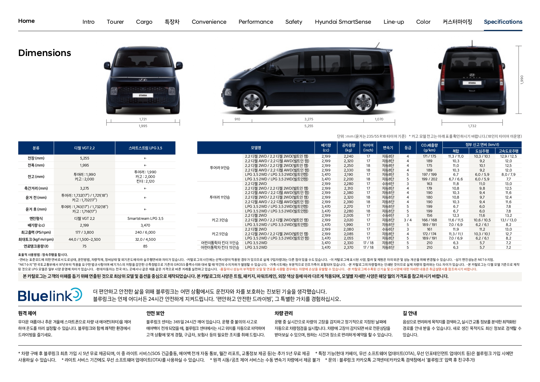 스타리아의 크기, 제원(스펙) 입니다.