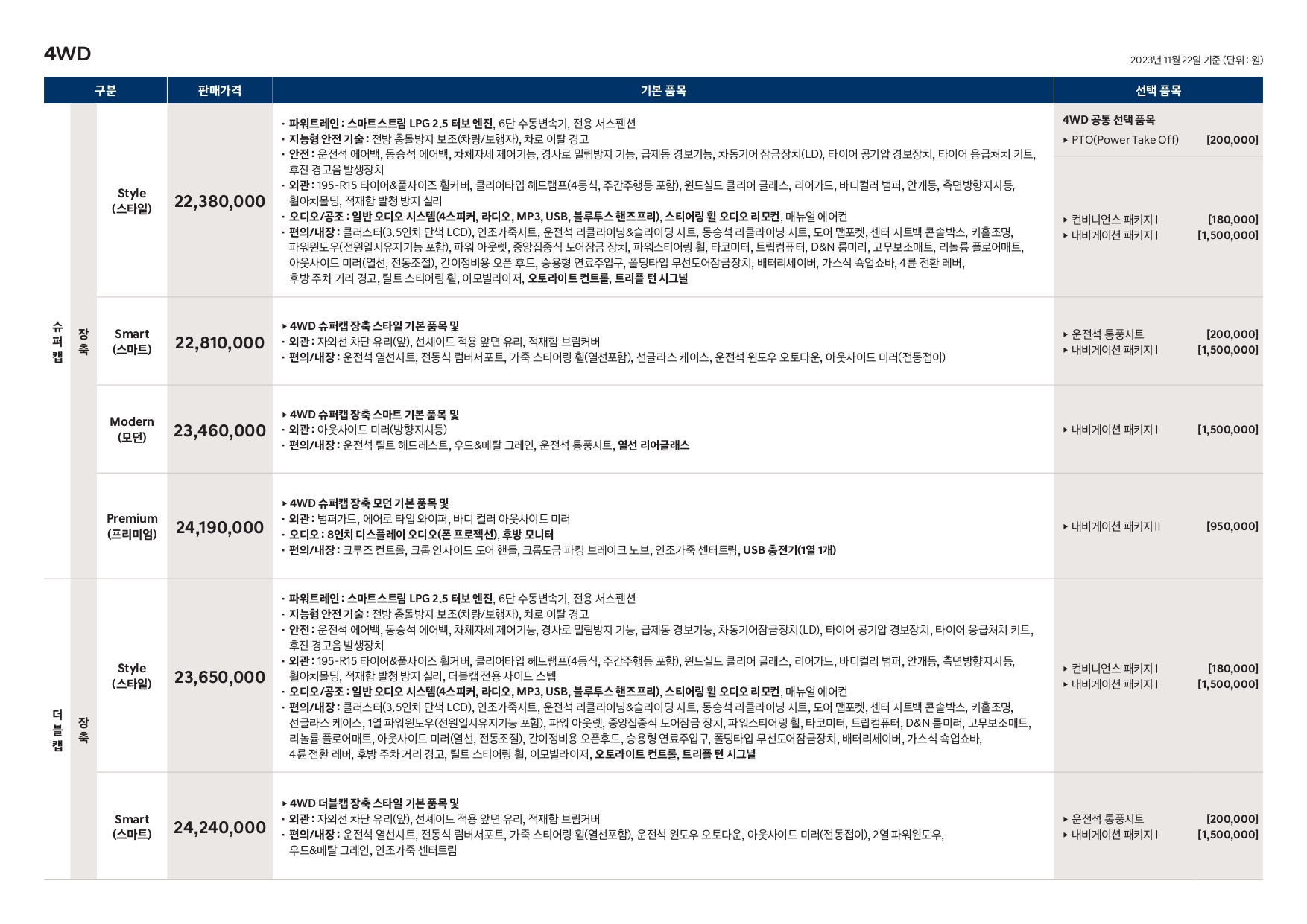 갭 종류는 슈퍼캡, 더블캡, 일반캡 모두 존재하고, 각 캡별로 스타일 / 스마트 / 모던 / 프리미엄 4가지의 트림을 또 준비하였습니다.