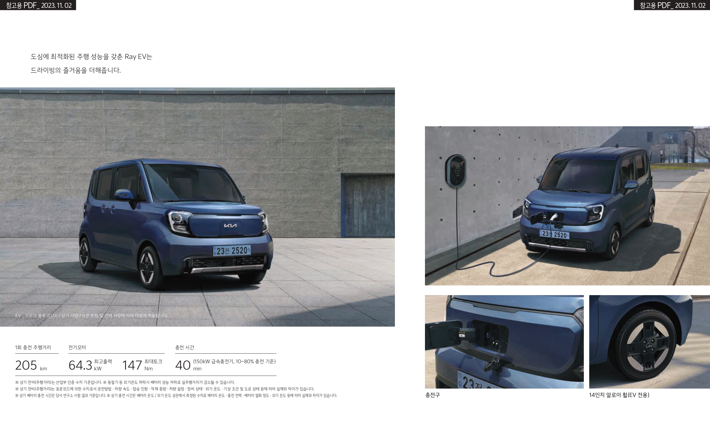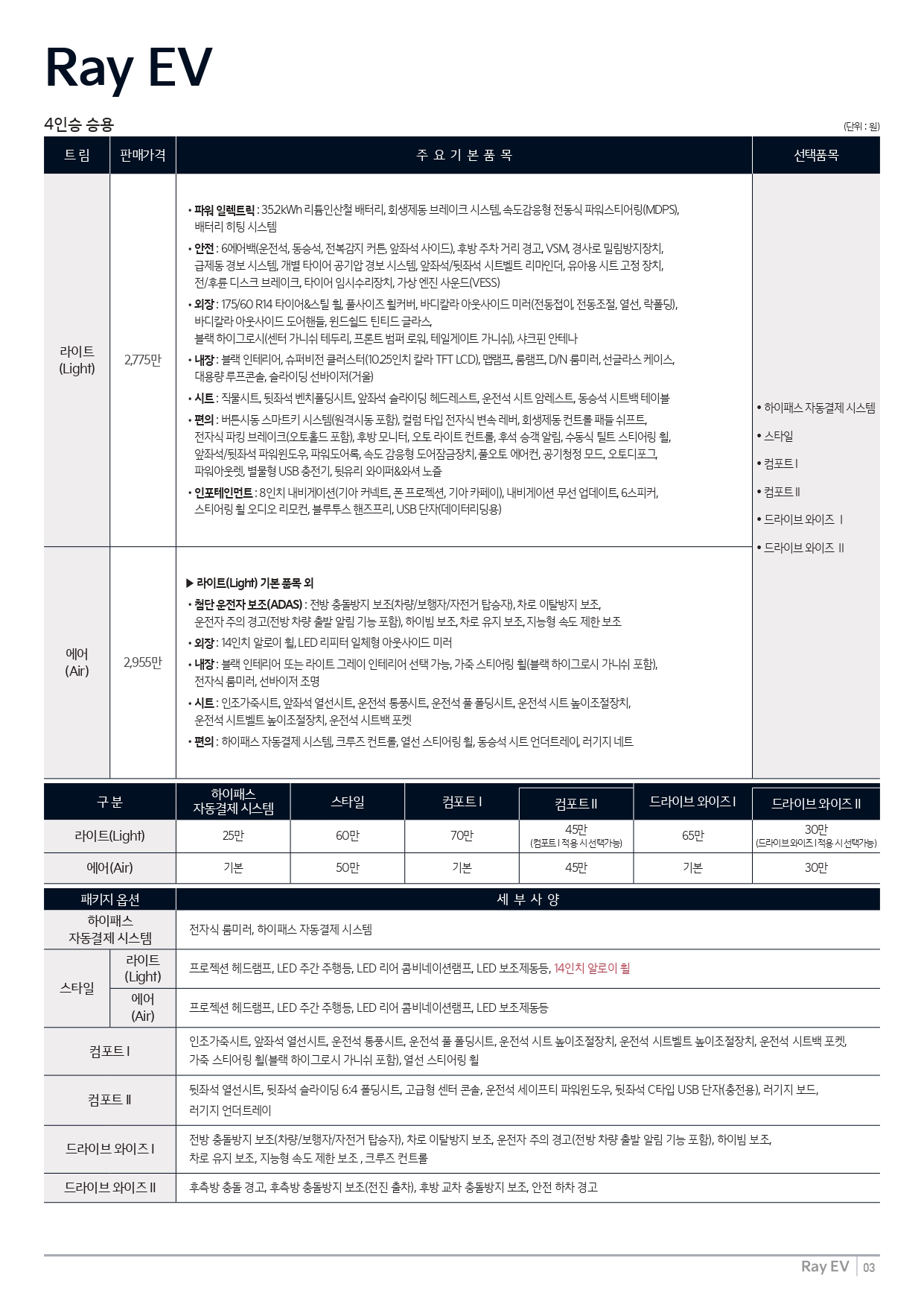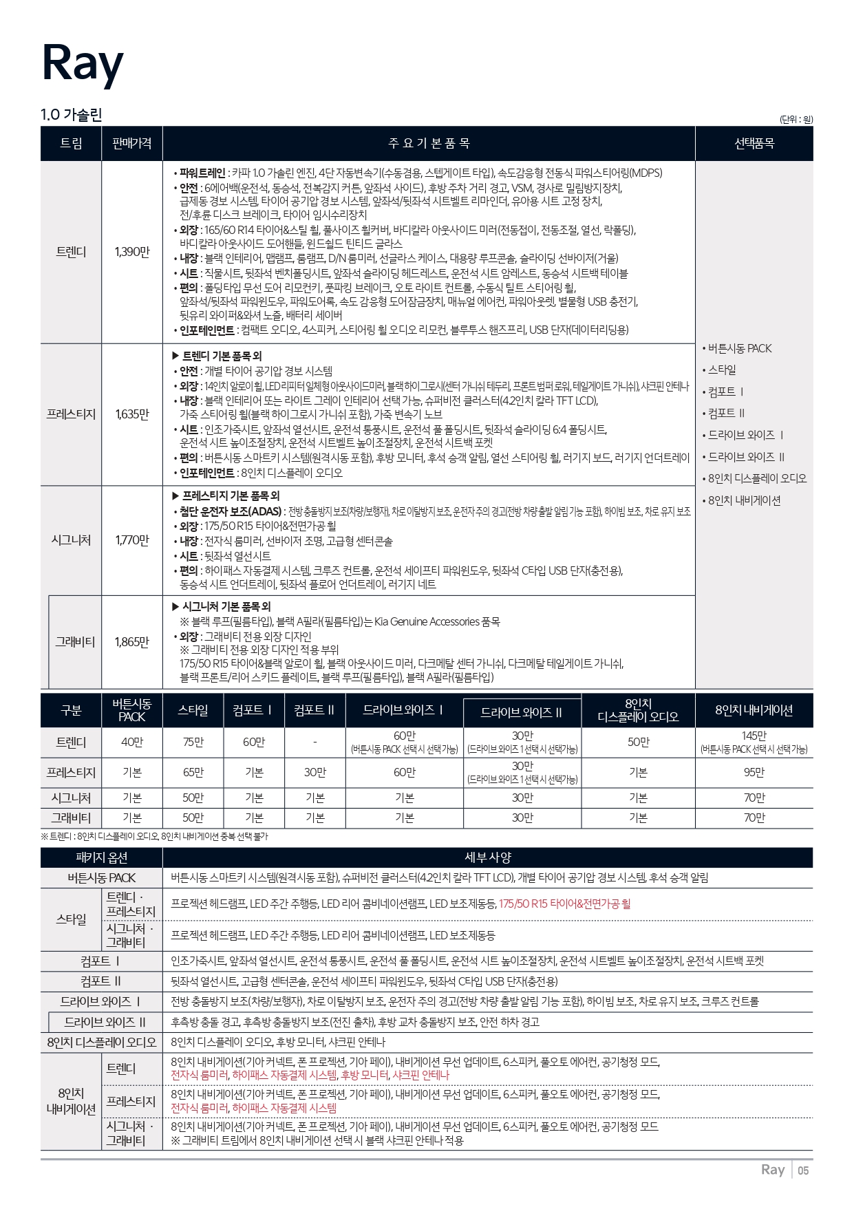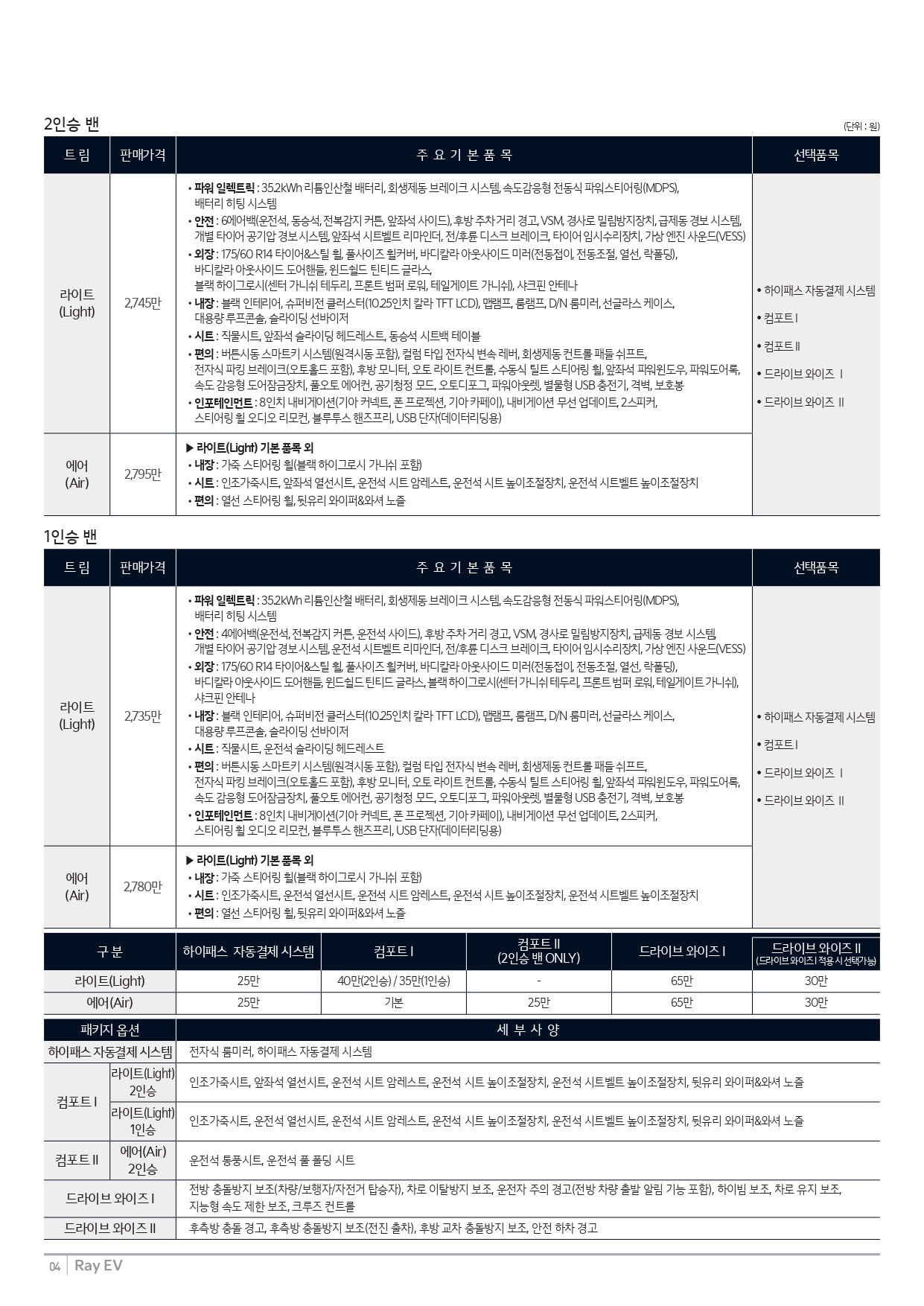 레이 가솔린 모델뿐만 아니라, EV 모델까지 함께 보여주고 있어 비교하기 좋은 자료입니다.