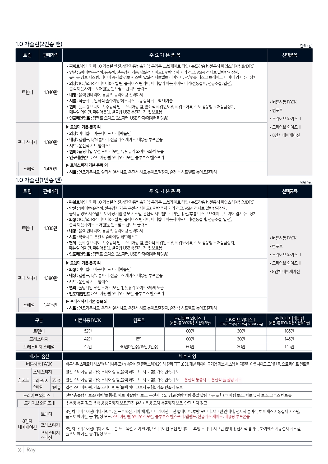 기아 레이 가솔린 모델과 전기차 모델의 경우, 카탈로그는 하나로만 되어 있고, 가격표는 별도로 구성되어 있어 하나씩 순서대로 보여드리도록 하겠습니다.