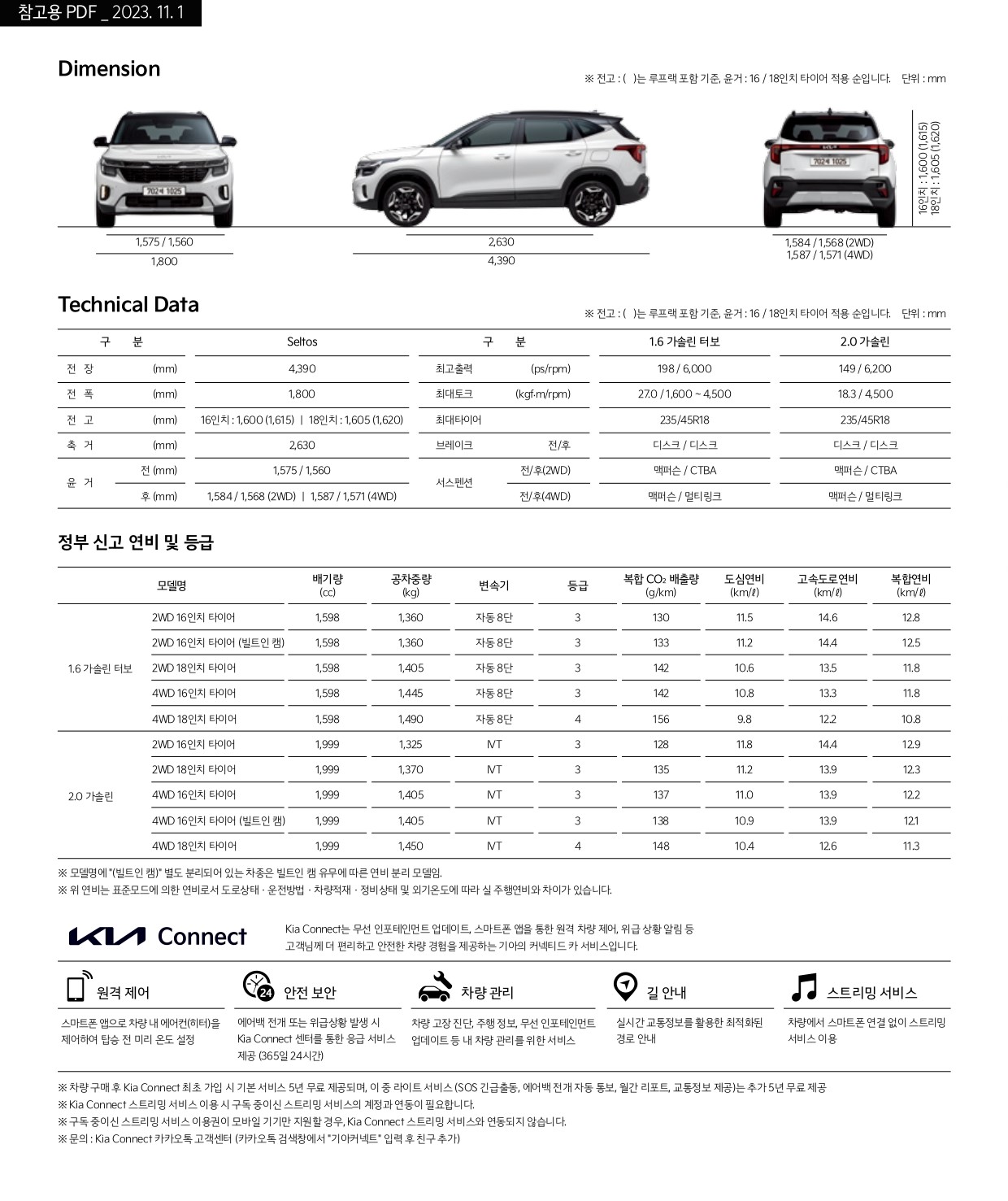 셀토스의 크기, 제원(스펙), 연비 정보입니다.