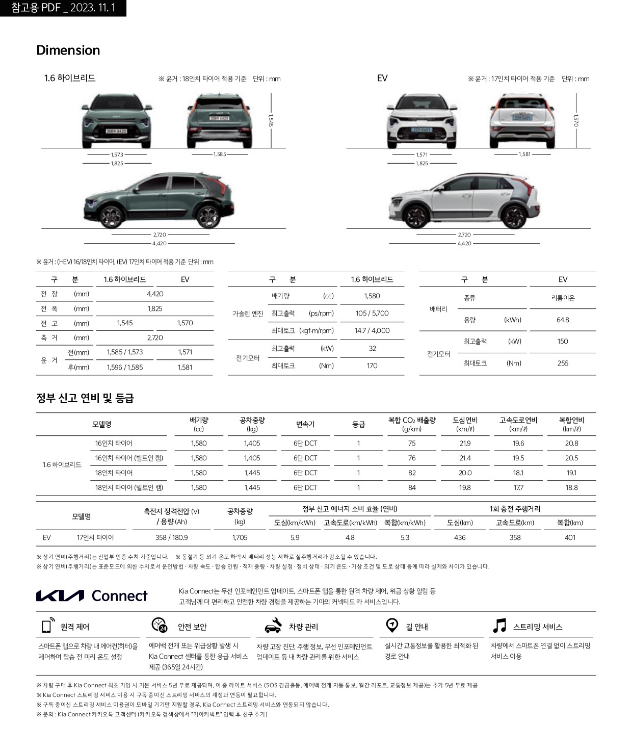 니로 및 니로 EV의 크기, 제원(스펙) 및 연비 자료입니다.