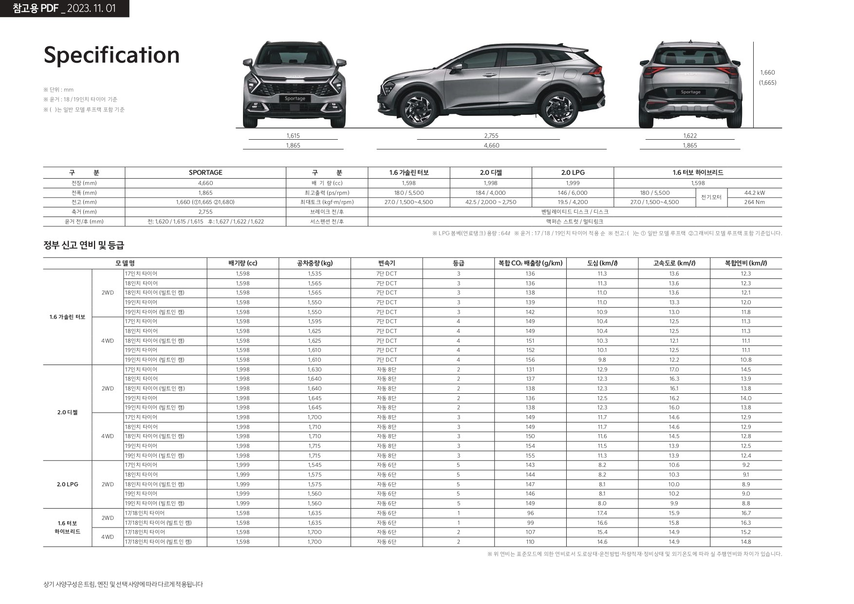 2024 스포티지의 크기, 제원(스펙) 및 연비 정보입니다.