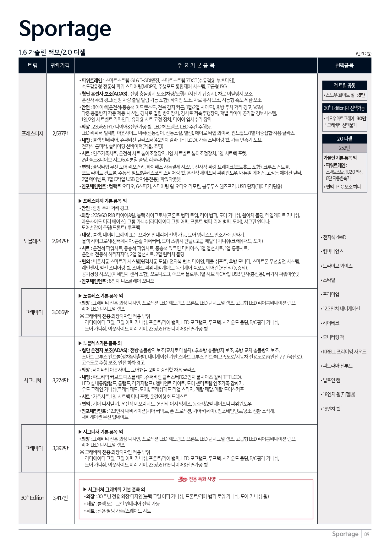 2024 스포티지 1.6 가솔린 / 2.0 디젤 가격표