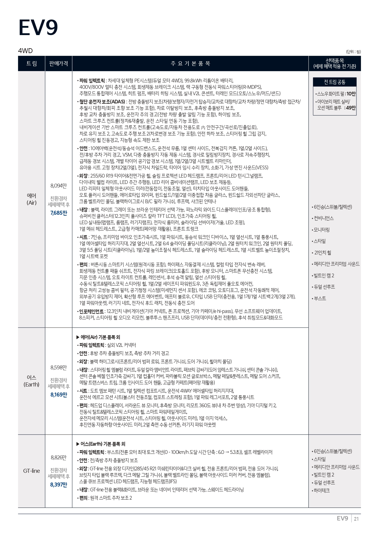 기아 EV6나 현대 아이오닉 계열의 경우, 저용량 배터리와 저출력 모터를 장착한 스탠다드 트림이 있는 반면, EV9는 오직 2WD or 4WD 모델 선택만 가능합니다.
