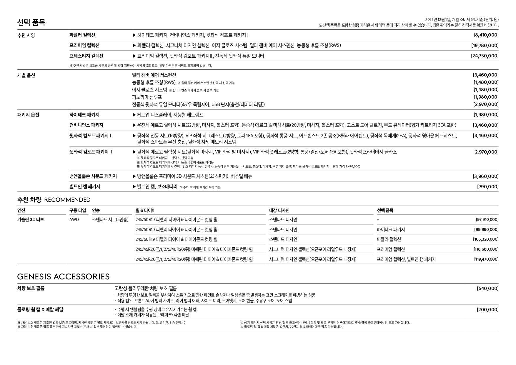 일반적으로 제네시스 라인업은 기본 모델에 다양한 선택 옵션을 선택할 수 있는 게 특징입니다만,