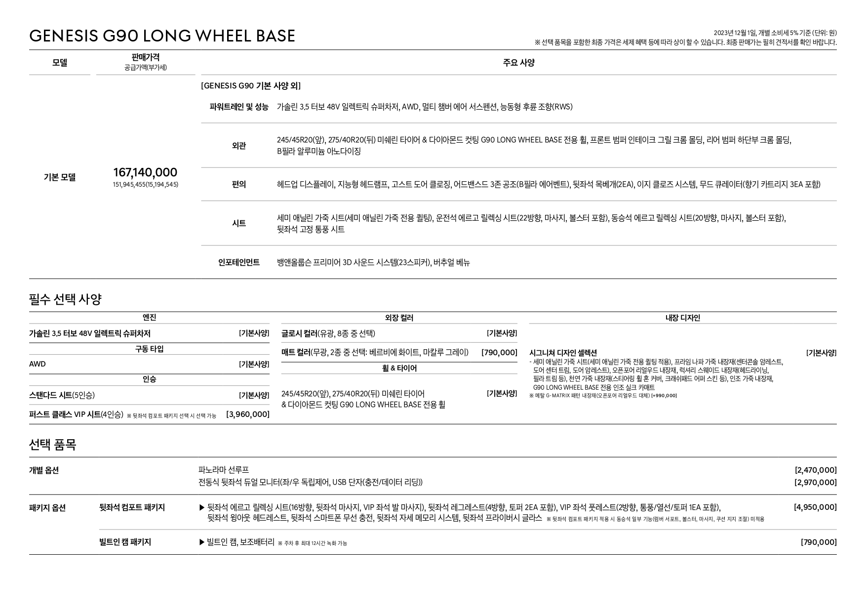 G90 롱 휠베이스 모델은 특이하게도, 거의 풀옵션 단일 트림으로 운영이 되고, 선택 옵션이 거의 없는 것이 특징입니다.