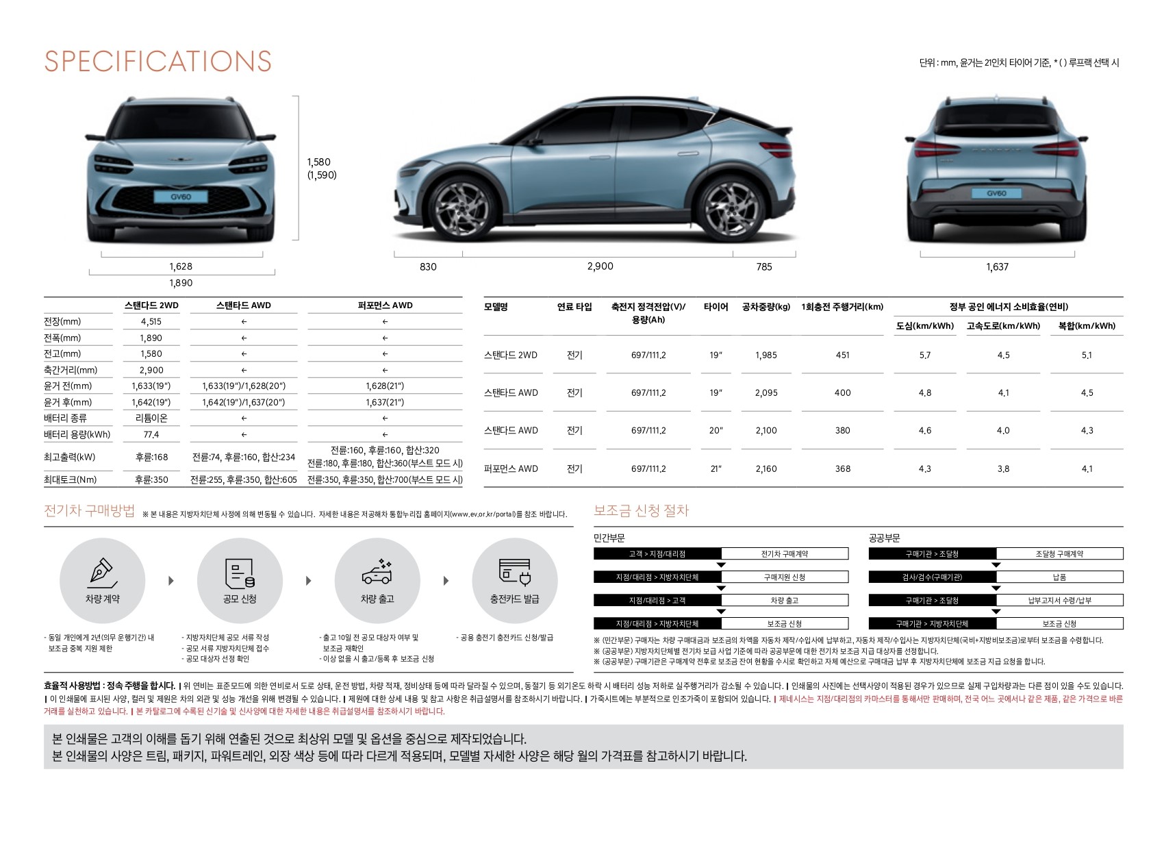 GV60의 크기, 제원(스펙) 및 주행가능거리 정보입니다.