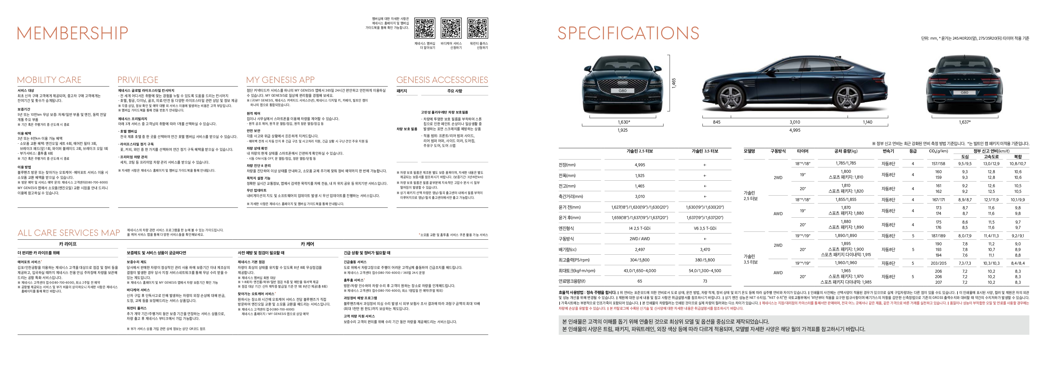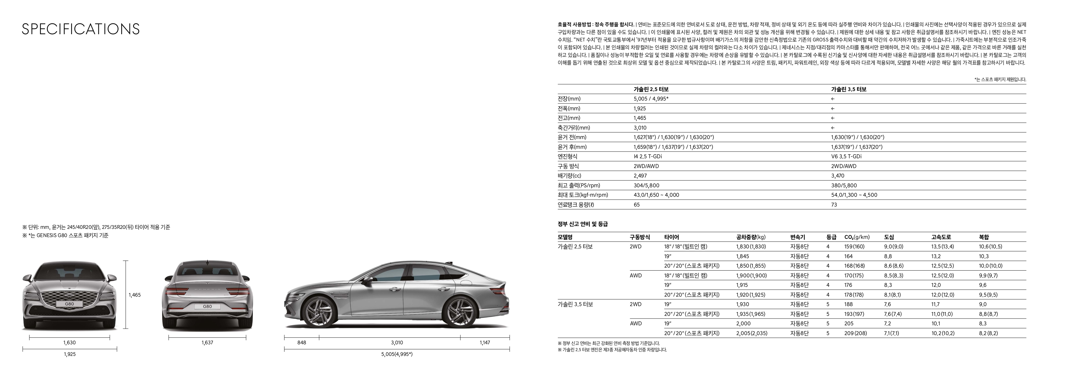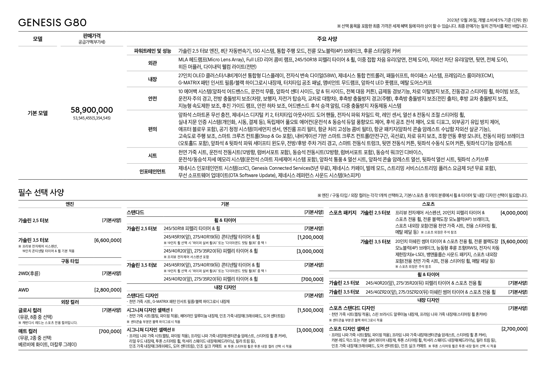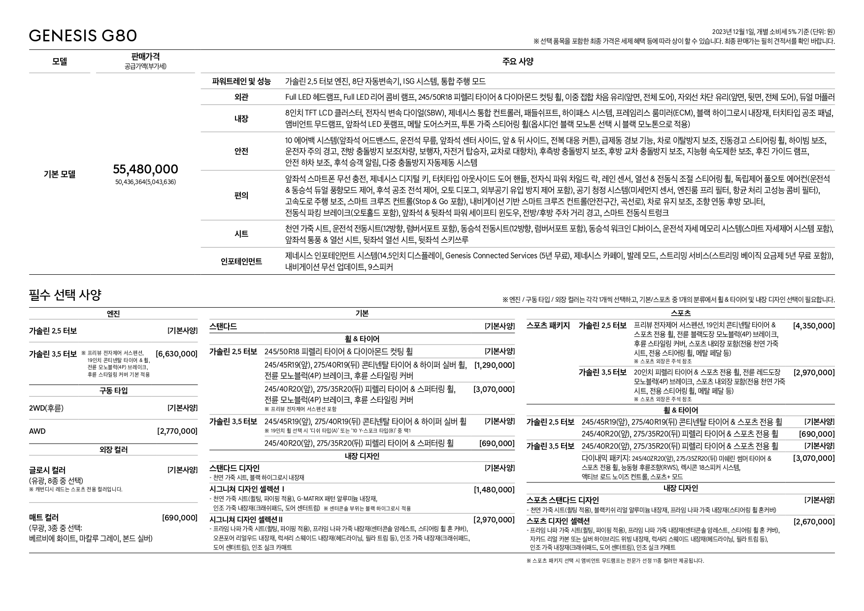 가격표는 아니지만, 23년형 및 24년형 G80의 제원표입니다.