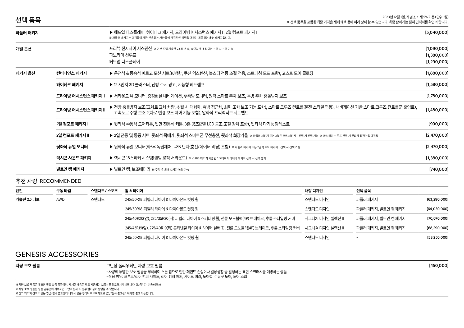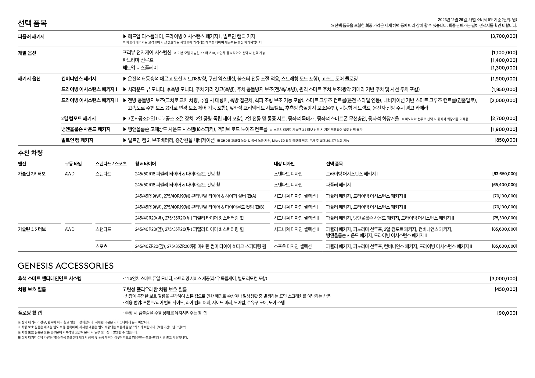 필수 선택 사양의 경우, 대부분의 옵션 가격은 큰 차이를 보이고 있지는 않습니다만, 가솔린 3.5 터보의 스포츠 패키지 가격이 상당히 차이가 많이 납니다.