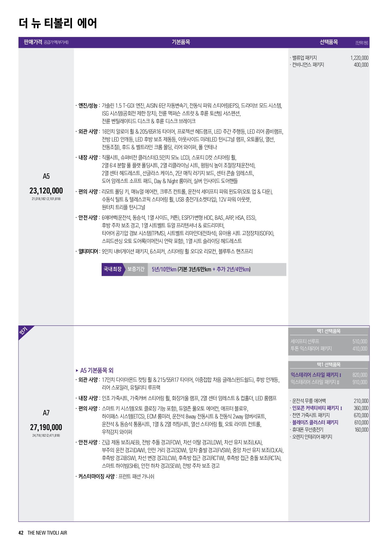 트림은 A5 및 A7 두 가지로 운영이 되는데, 옵션 구성은 일반 티볼리 1.5 터보와 비슷합니다.