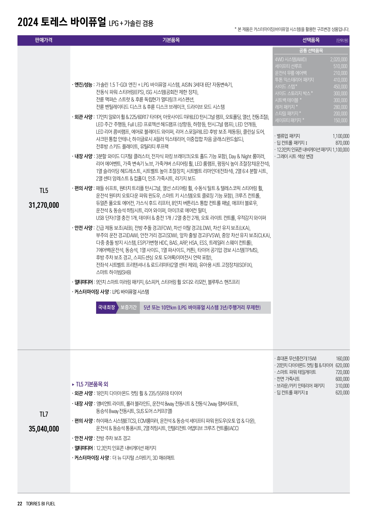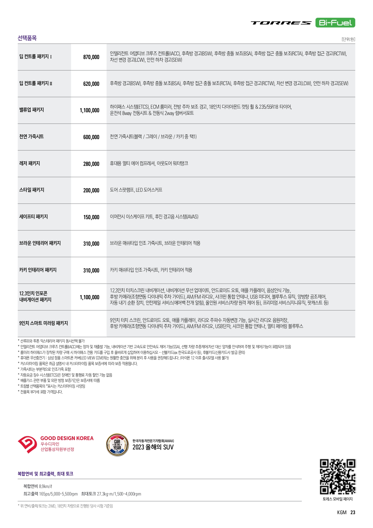 2024 토레스 바이퓨얼 (LPG + 가솔린) 가격표