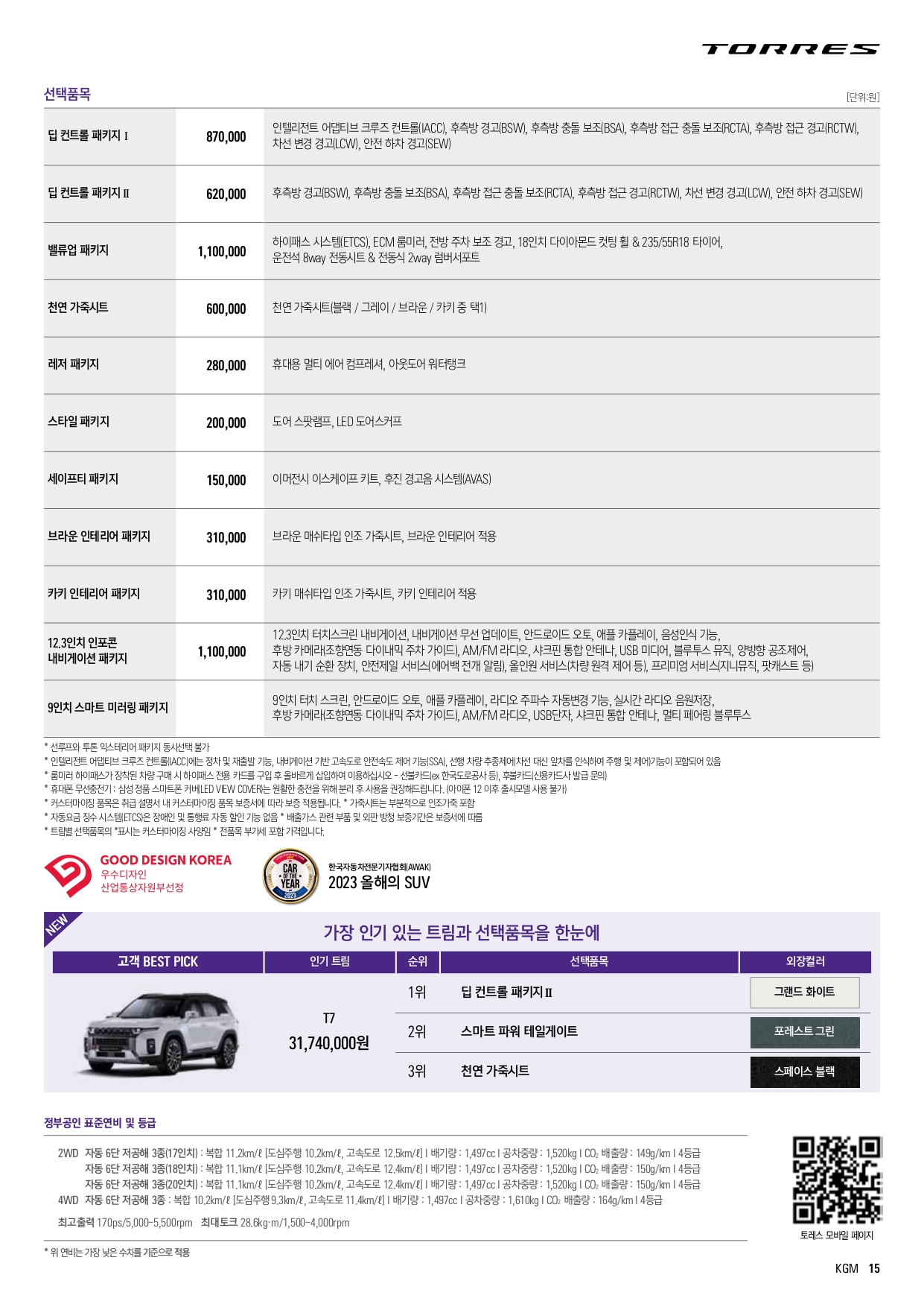 2024 토레스 1.5 가솔린 가격표