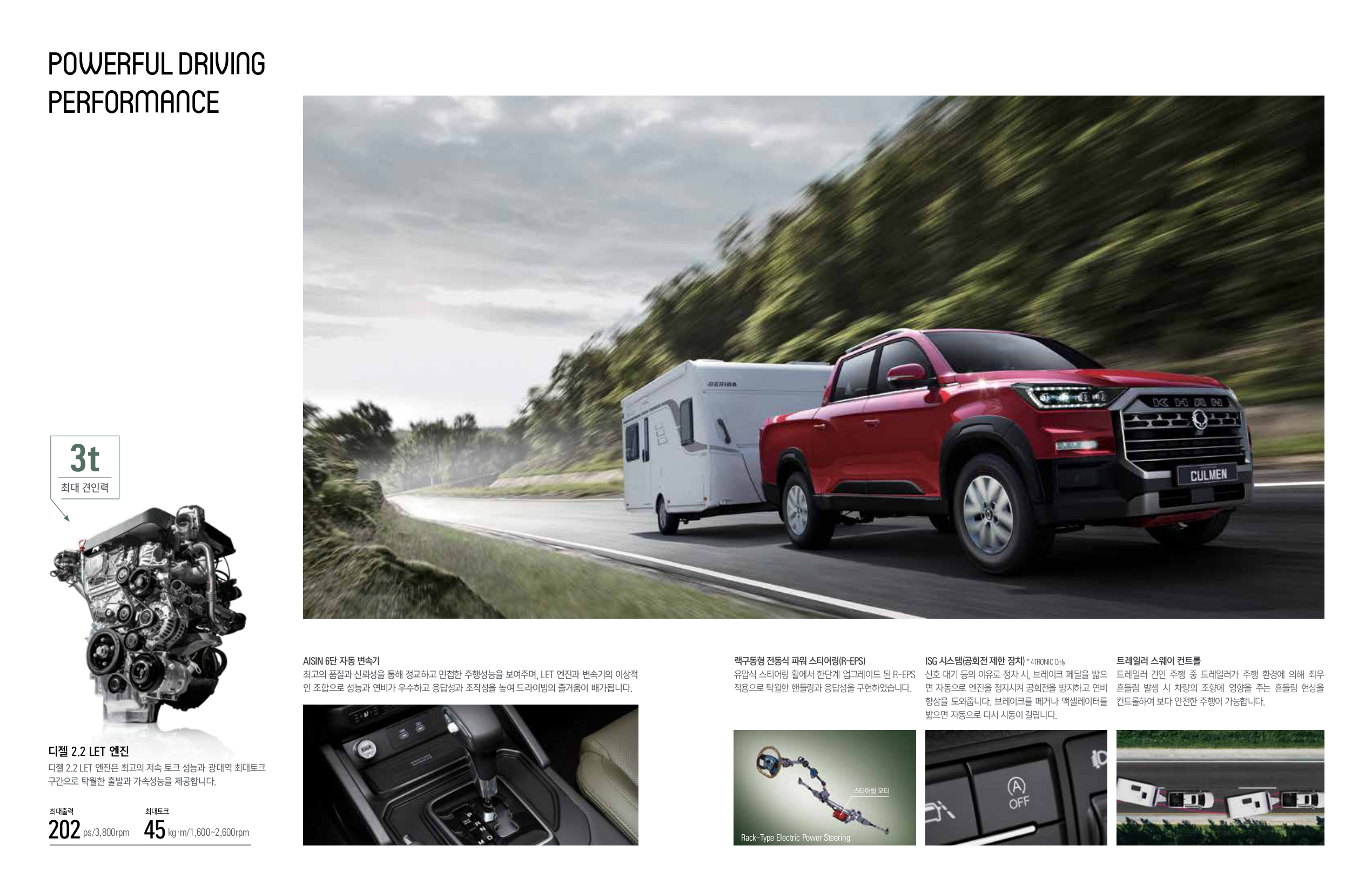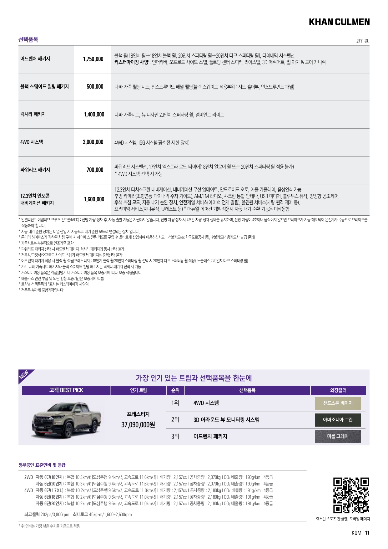 단, 선택 옵션은 차이가 있는데, 렉스턴 스포츠 칸 모델만 파워리프 패키지, 그리고 럭셔리 패키지 선택이 가능한 점은 또 다른 차이점입니다.