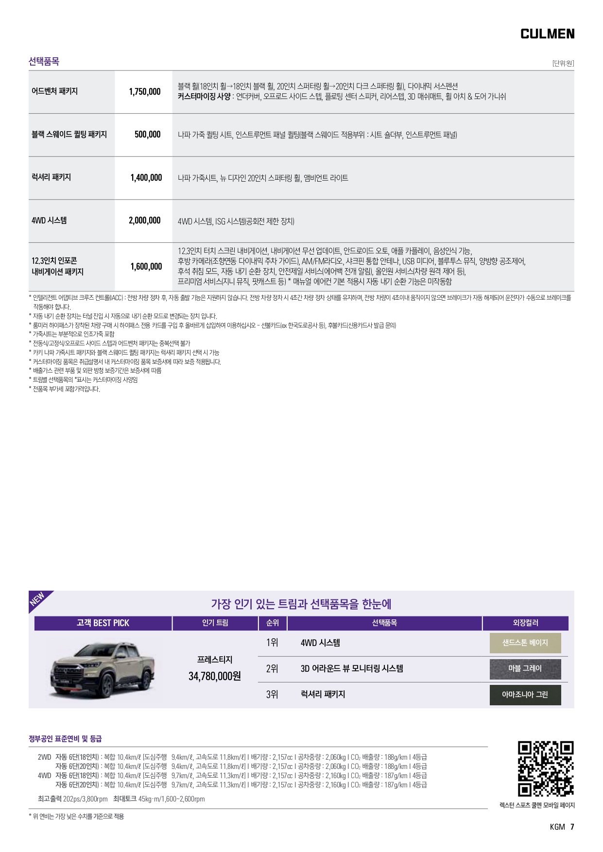 단, 선택 옵션은 차이가 있는데, 렉스턴 스포츠 칸 모델만 파워리프 패키지, 그리고 럭셔리 패키지 선택이 가능한 점은 또 다른 차이점입니다.