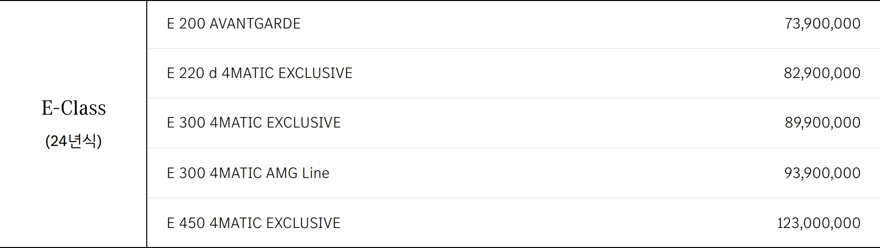 비교하여 보시기 좋게, 23년식(구형) E클래스 가격과 24년식(신형) E클래스 가격 모두 준비하였습니다.