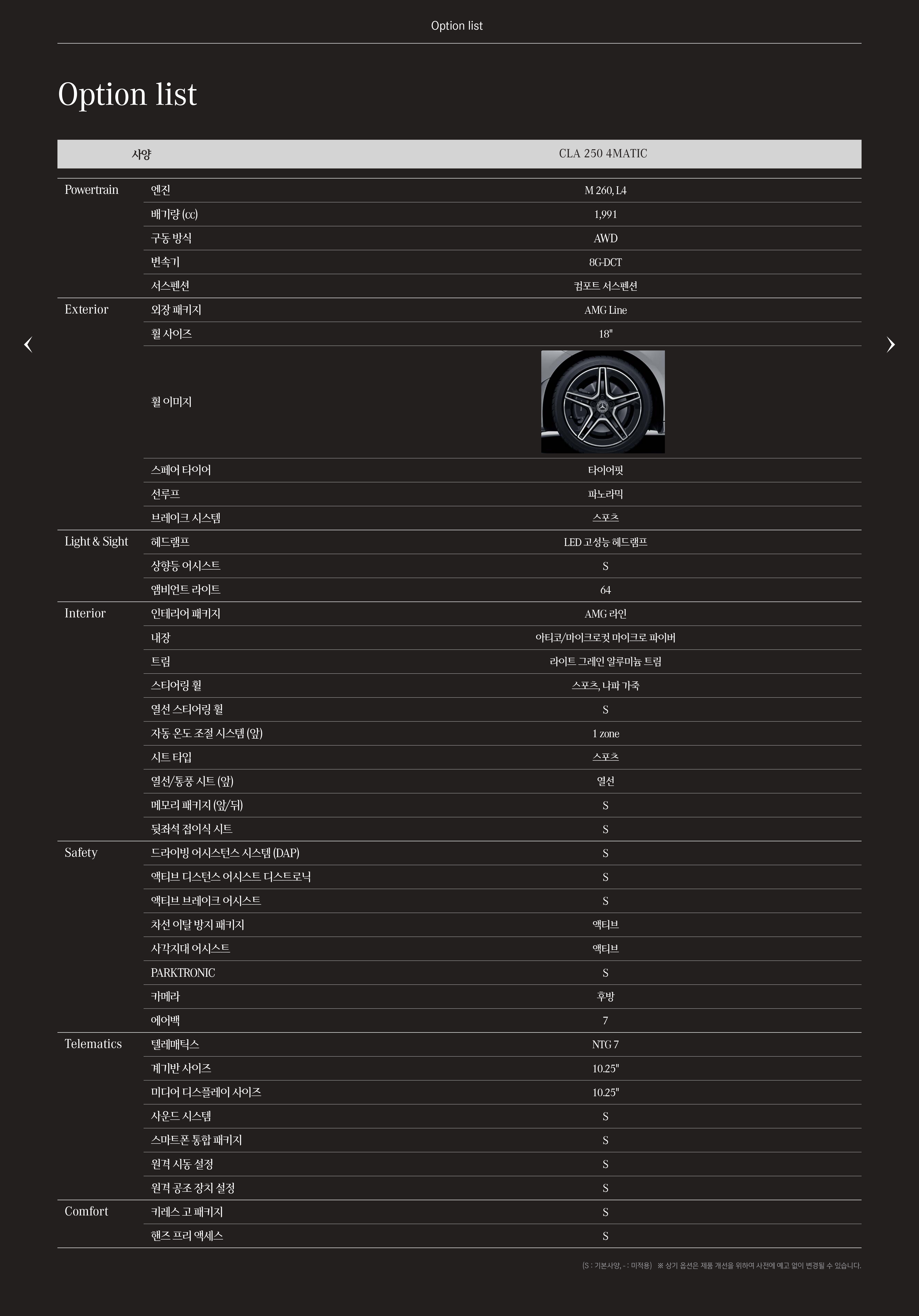 마지막으로 CLA250 4매틱의 제원(스펙) 입니다.