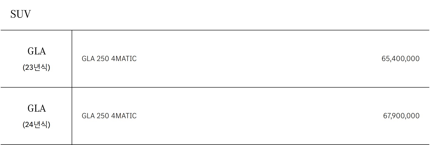 23년형과 24년형 GLA 모두 가격이 공개가 되어 있는데, 24년형으로 오면서 가격이 조금 올랐습니다.