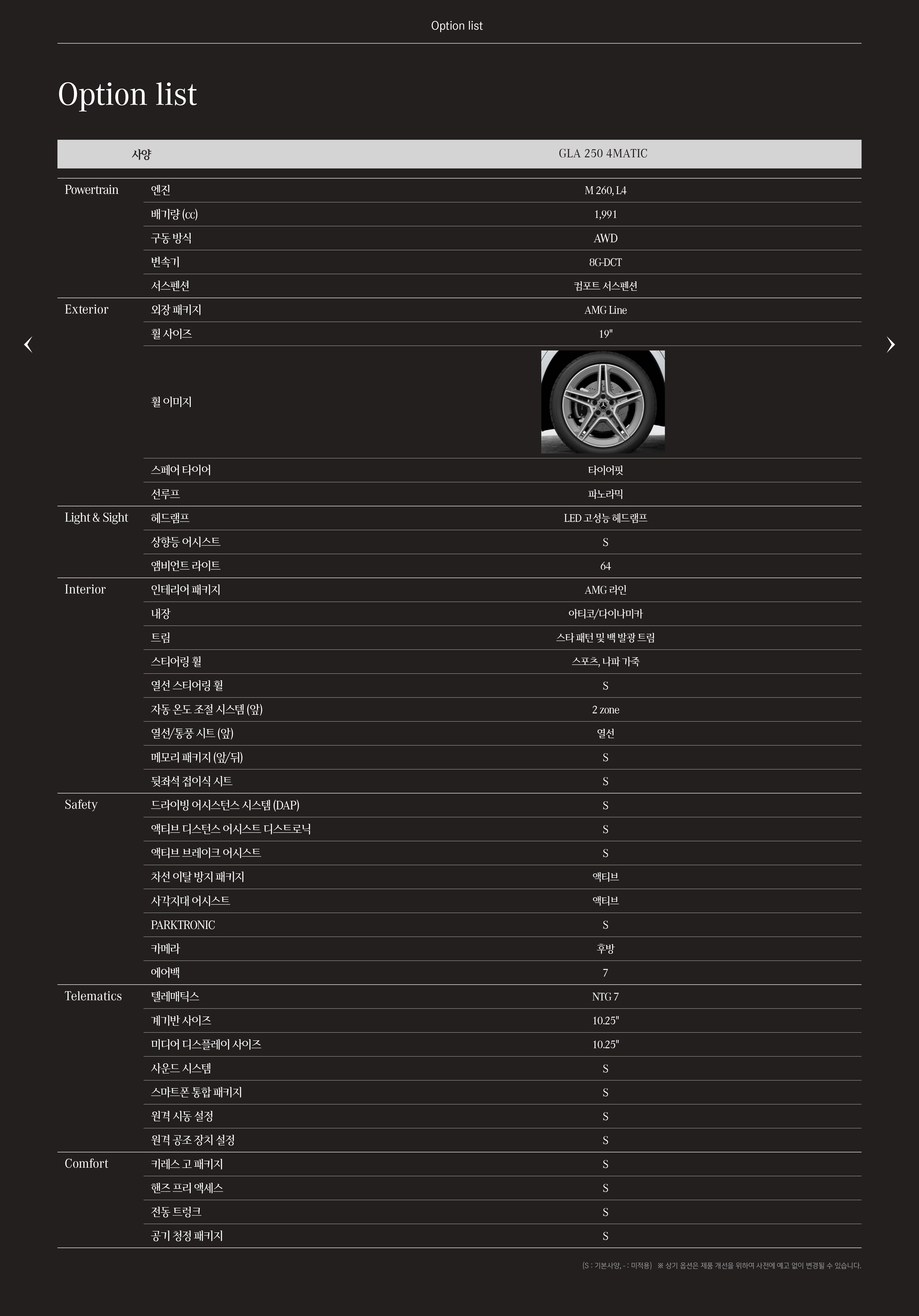 사실, 벤츠 GLA는 가격이나 옵션 자체가 상당히 단순한 편인데, 이는 벤츠에서 오직 GLA250 4매틱 이라는 1차종만 수입을 하기 때문입니다.