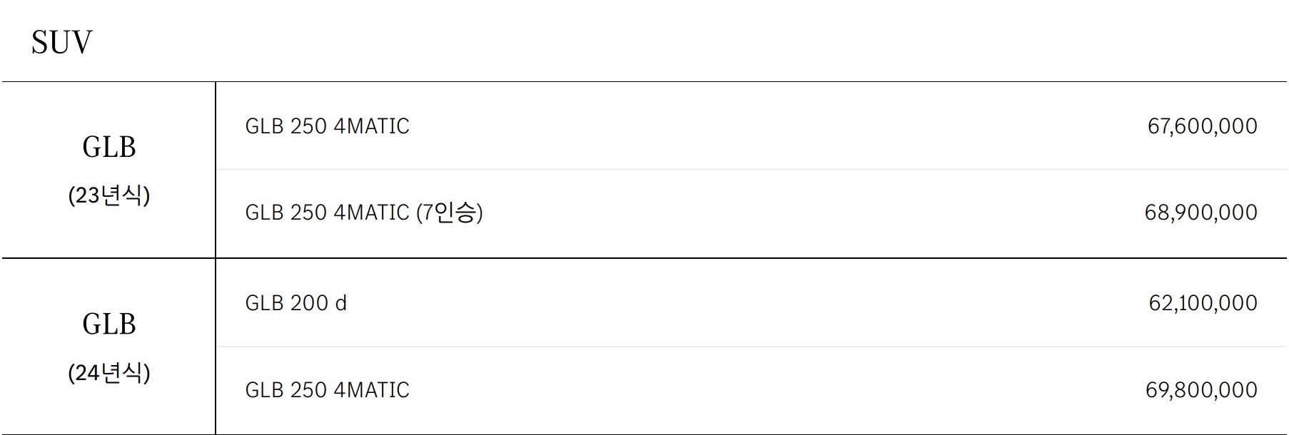 2023 & 2024 벤츠 GLB 가격표입니다.
