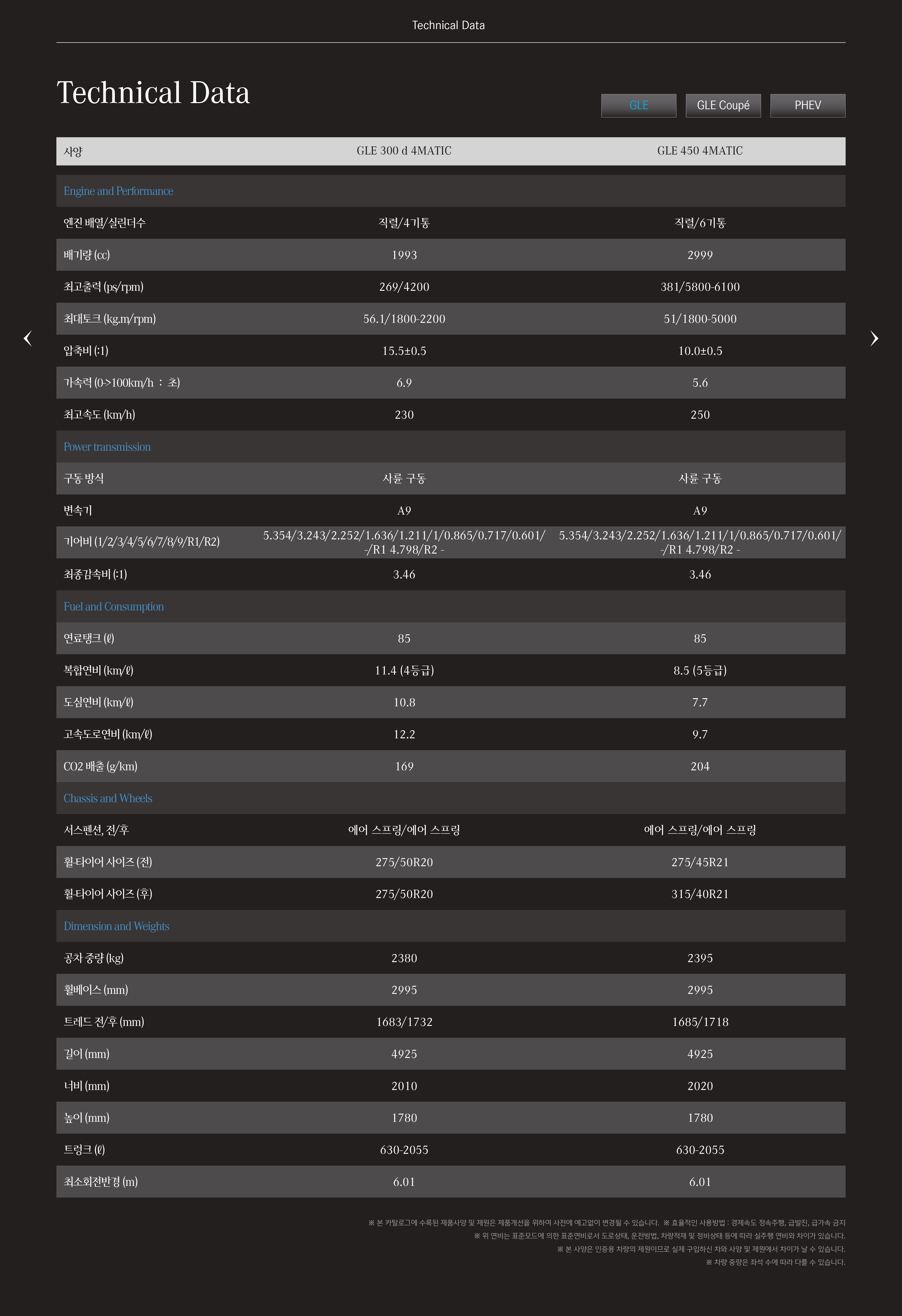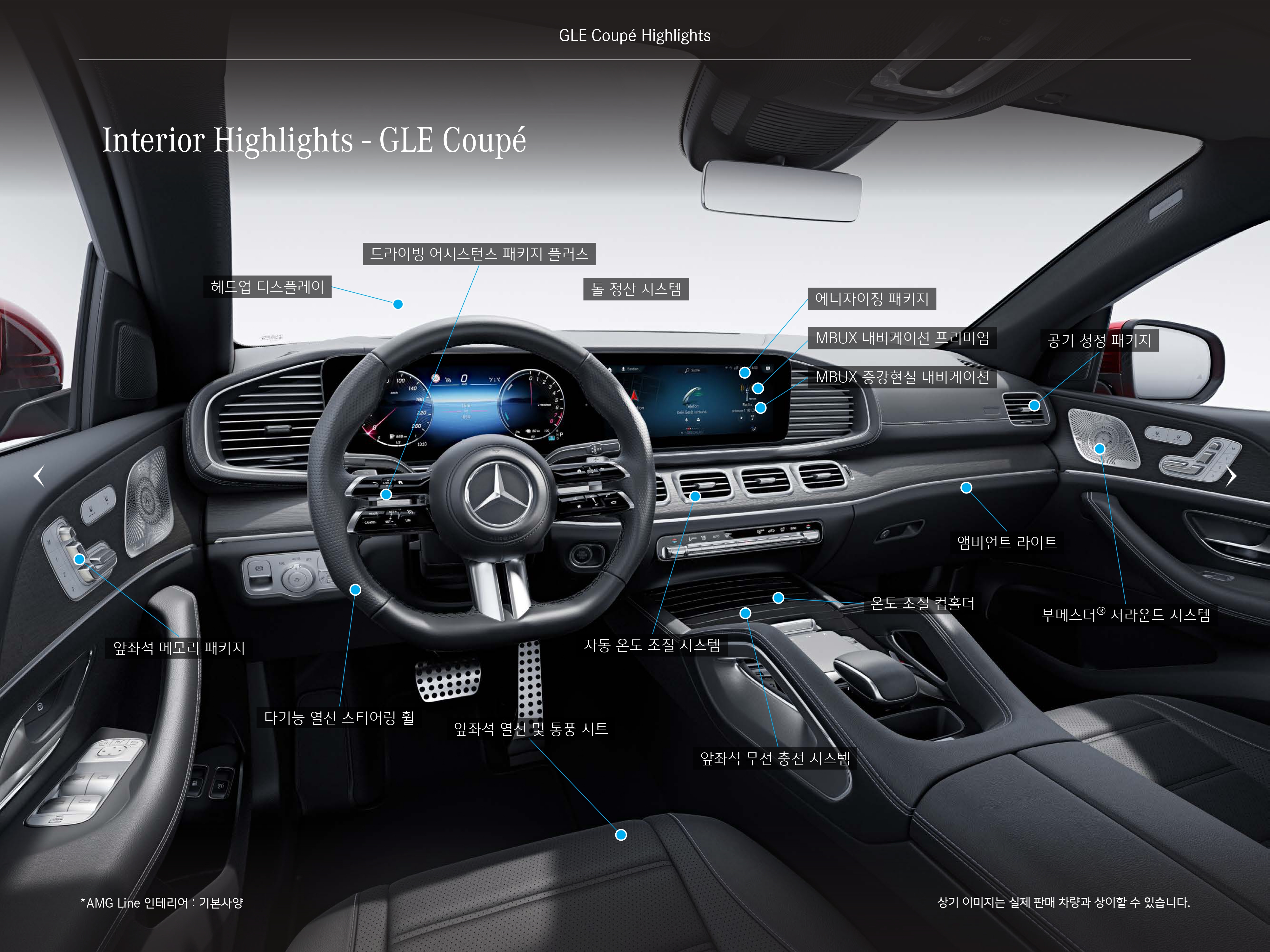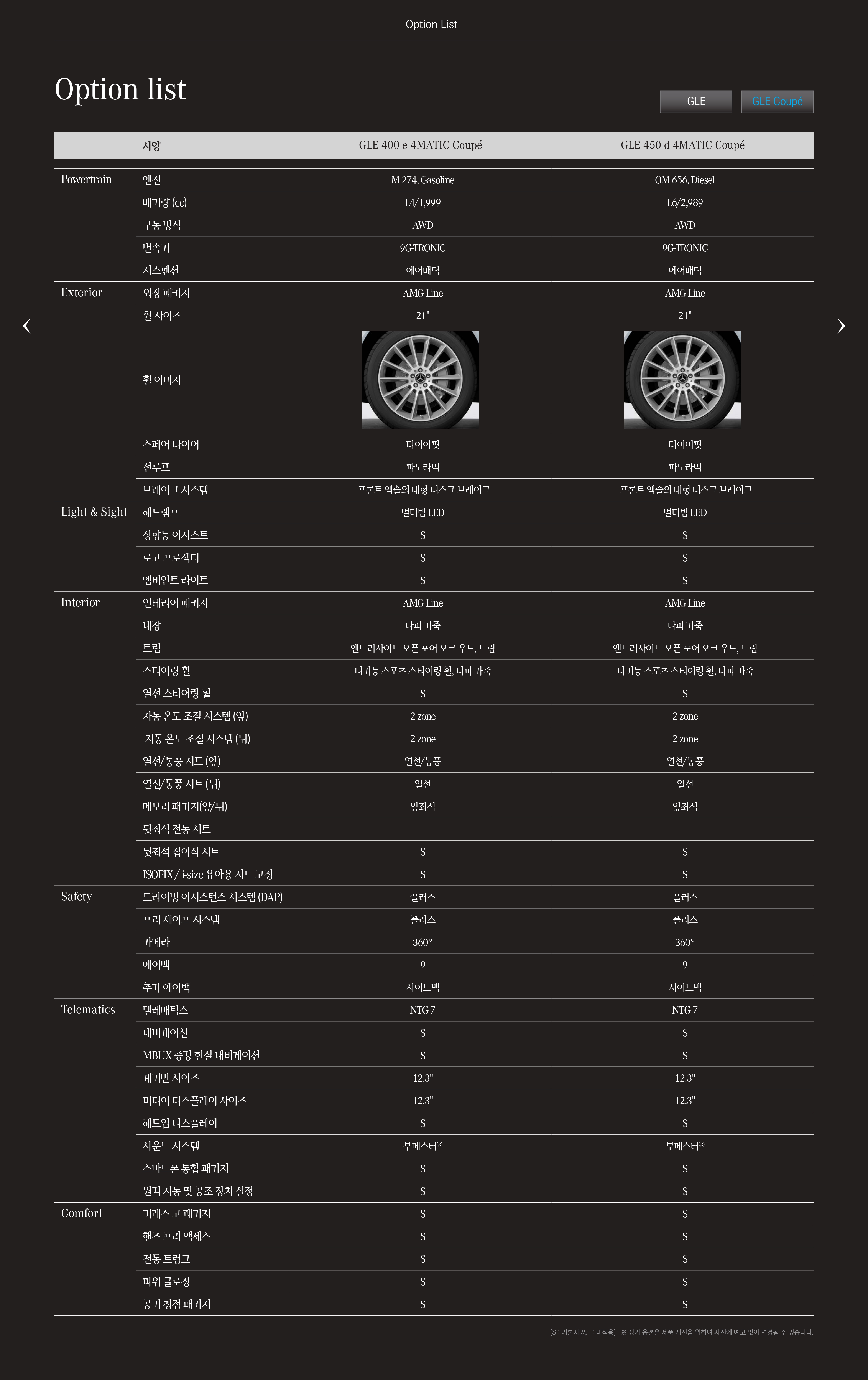 현재는 GLE450d 단일 트림만 판매 중이기도 하고, GLE450e 및 GLE450d 쿠페 두 모델 모두 옵션은 동일해서, 아래의 이미지로 봐주시면 됩니다.