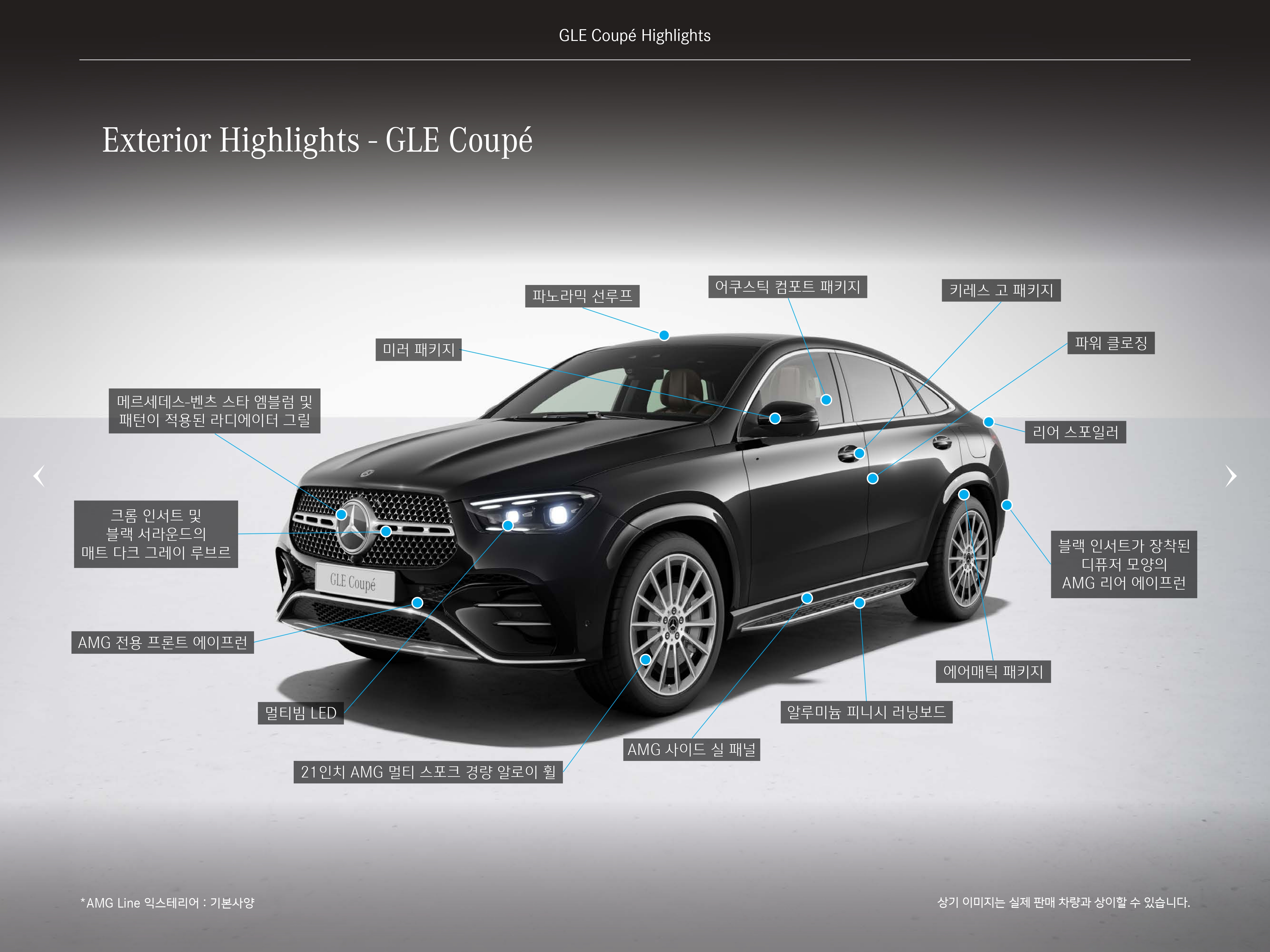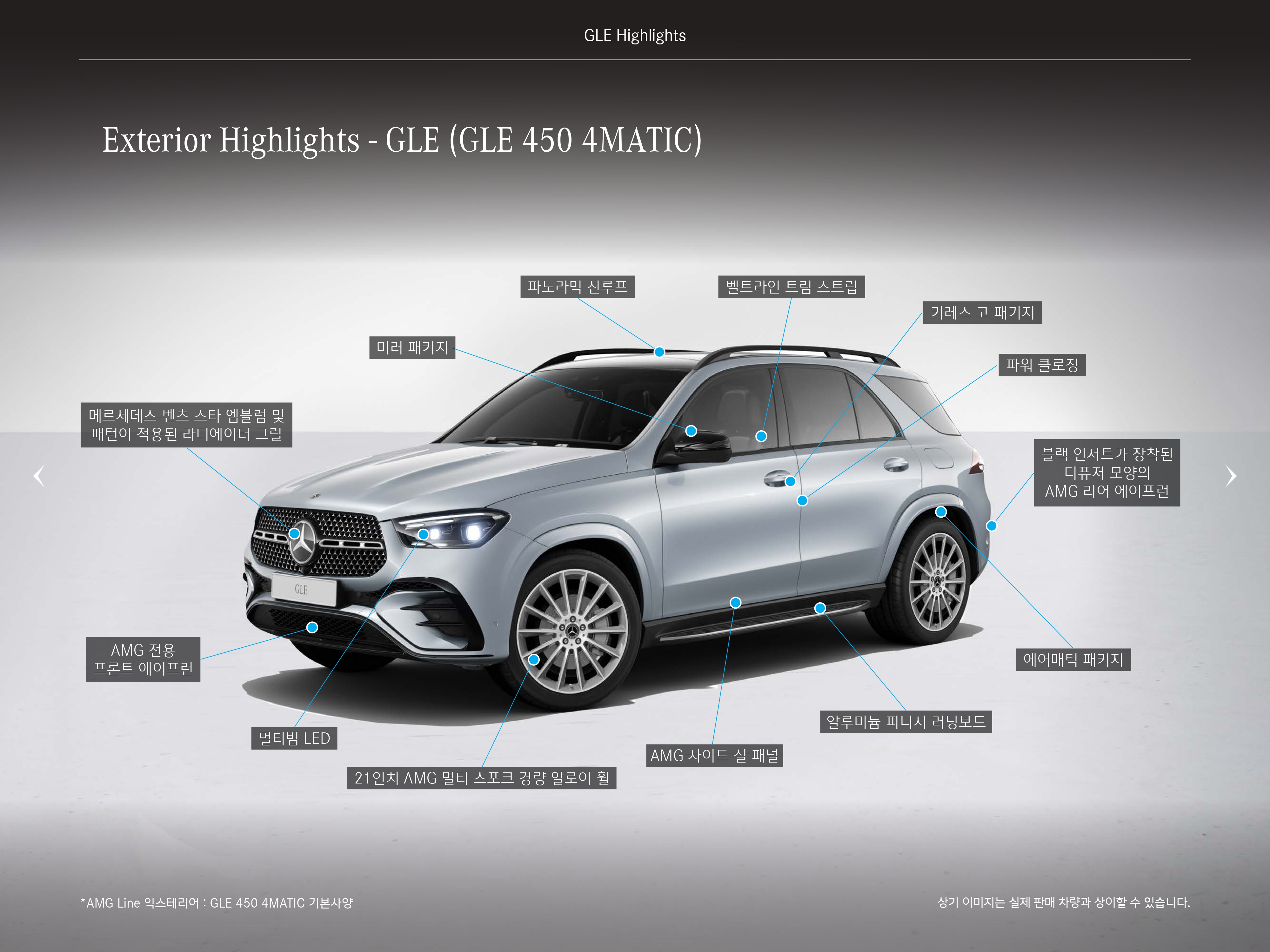 일반 SUV인 GLE와는 달리, 외부 및 내부 모두 AMG 패키지가 적용된 것이 주요 특징입니다.