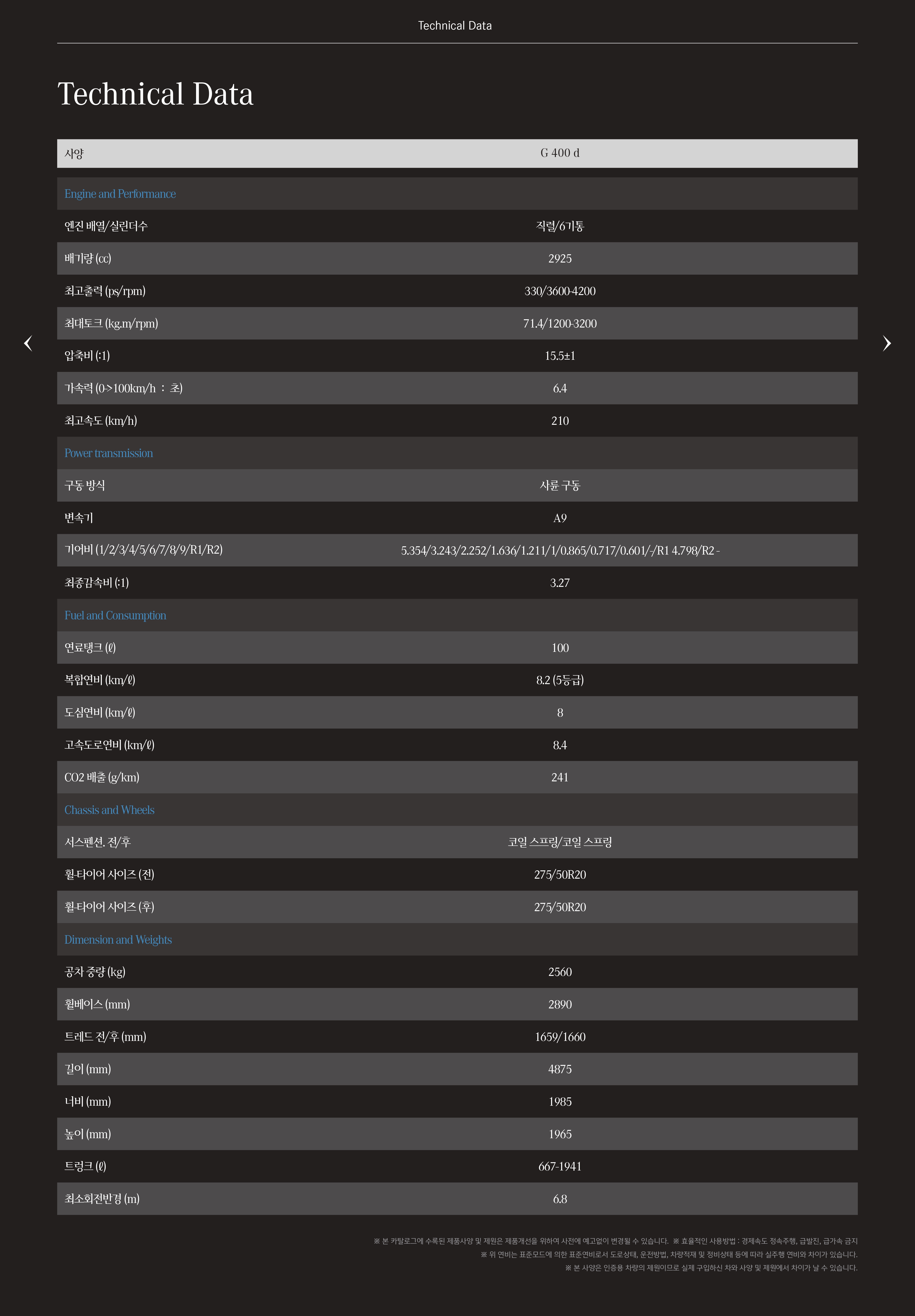 혹시나 필요하신 분 계실까 봐, G400d 제원(스펙) 정보입니다.