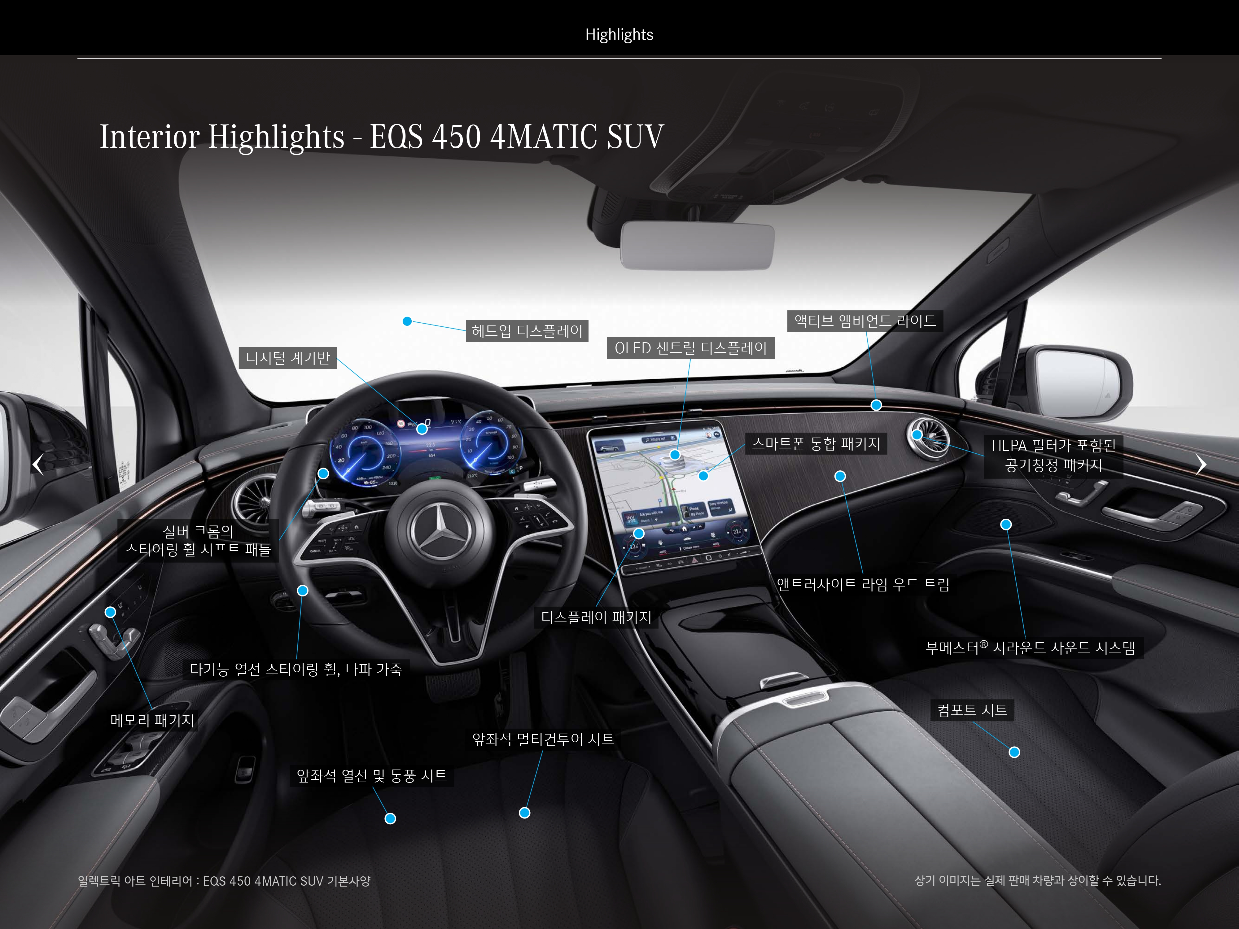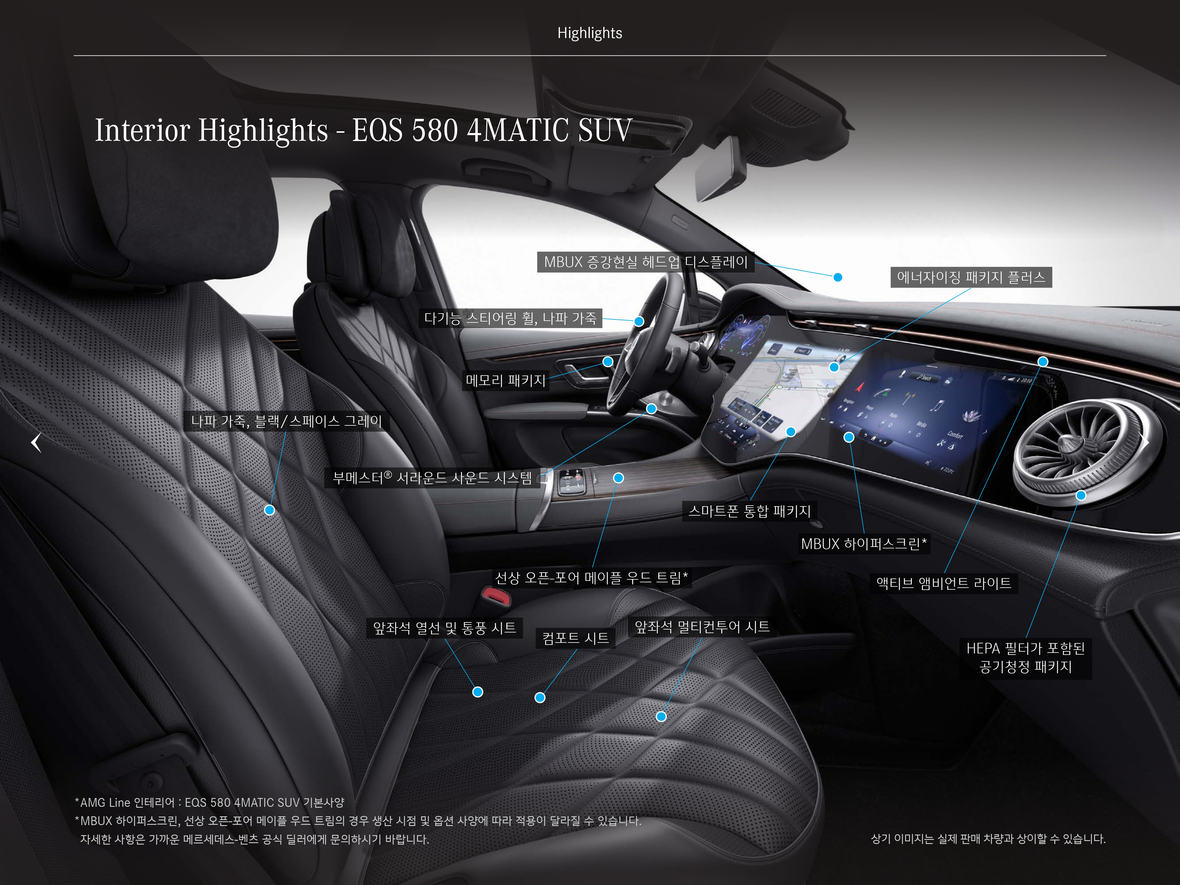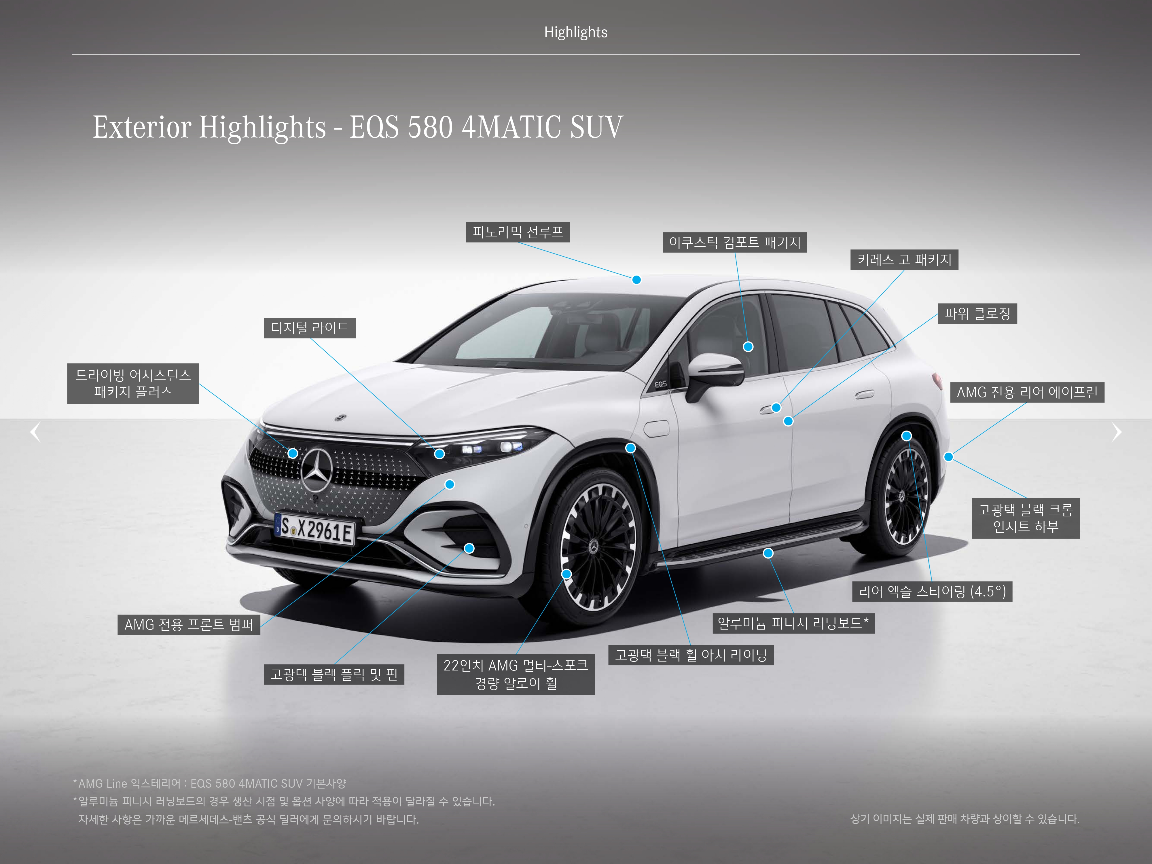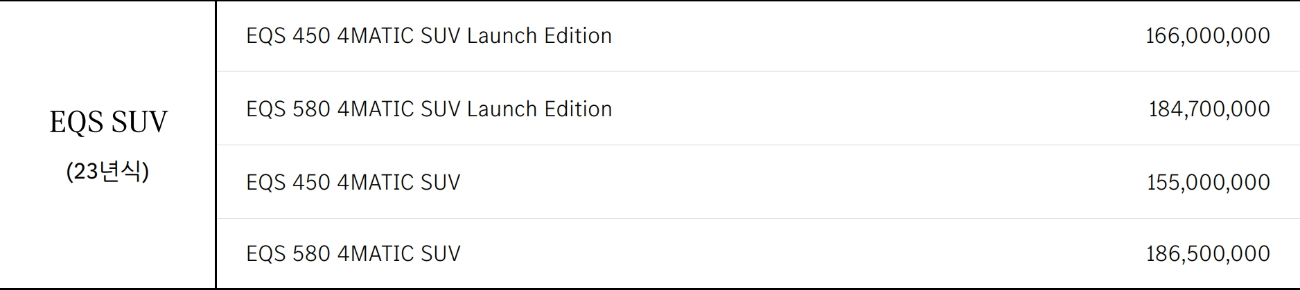 런치 에디션은 가격과 옵션이 조금 달라 별도로 있으며, 모델 자체만 놓고 보면 크게 EQS 450 4매틱 SUV와 EQS 580 4매틱 SUV 로 나누어집니다.