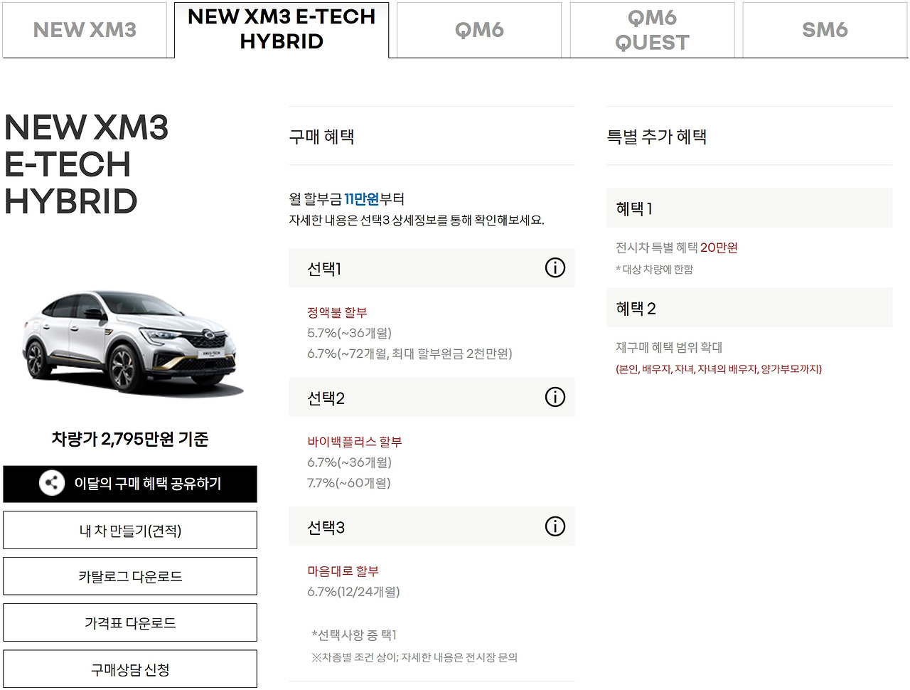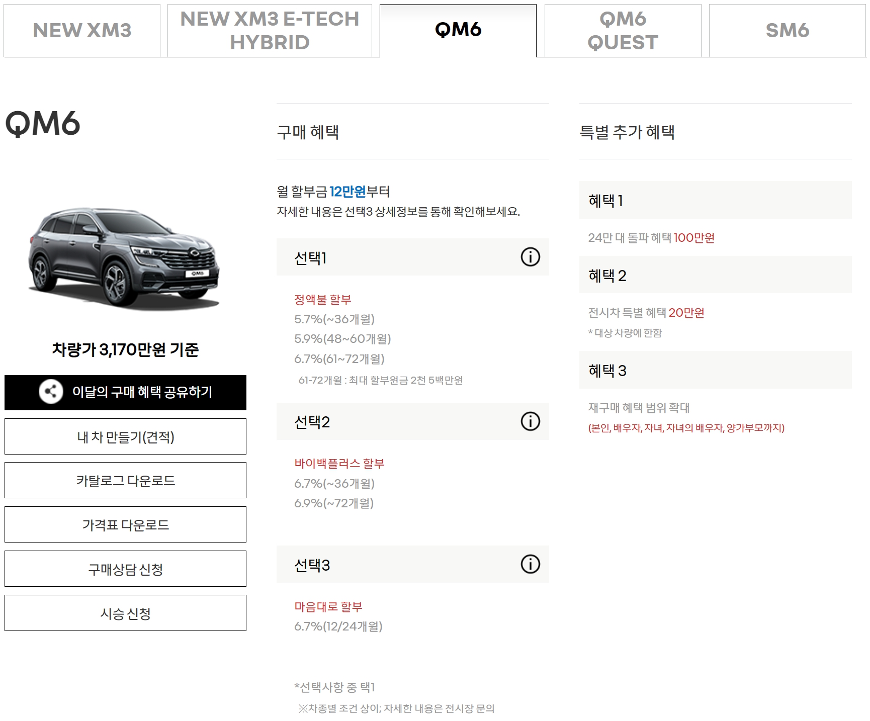 지난달의 경우, QM6 승용 모델은 72개월 할부가 되었지만, 퀘스트 모델은 안되던 것이, 이번 달부터는 모두 다 72개월 할부가 선택 가능하게 바뀌었습니다.