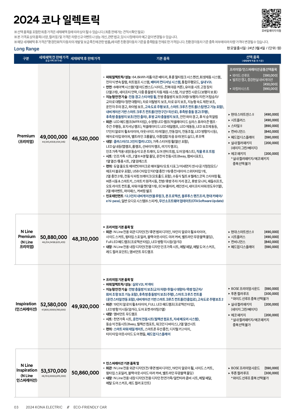 코나 가솔린 및 하이브리드는 올 해 2월에 이미 24년형 가격표를 공개하였고, 이번에는 전기차인 코나 일렉트릭만 가격표를 공개한 것입니다.
