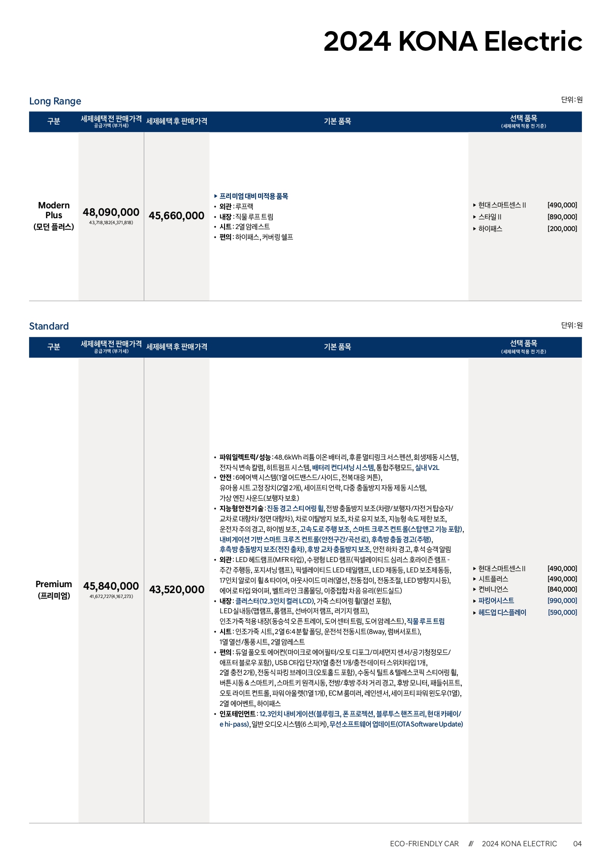 코나 가솔린 및 하이브리드는 올 해 2월에 이미 24년형 가격표를 공개하였고, 이번에는 전기차인 코나 일렉트릭만 가격표를 공개한 것입니다.