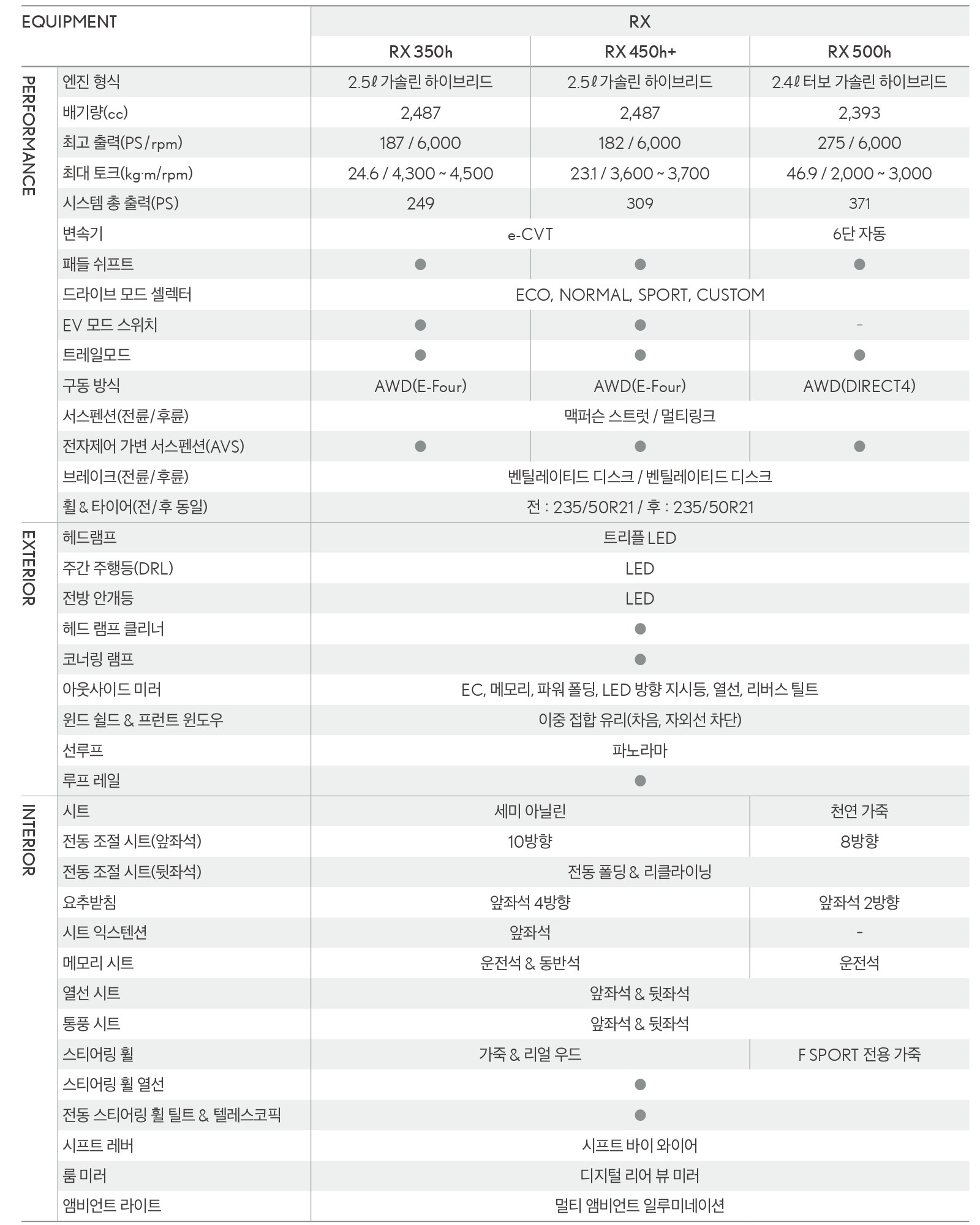 같은 파워트레인 내라면, 옵션에 대한 차등을 두게 마련이지만, RX는 파워트레인 별 트림이 단 1개뿐이기 때문에, 다 풀옵션으로 보시면 됩니다.
