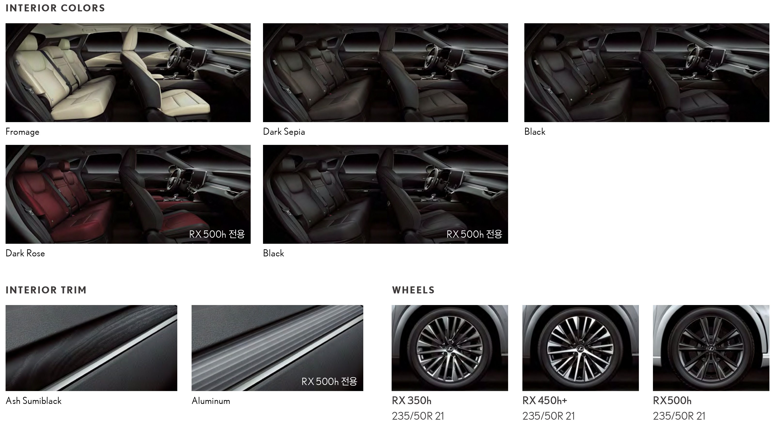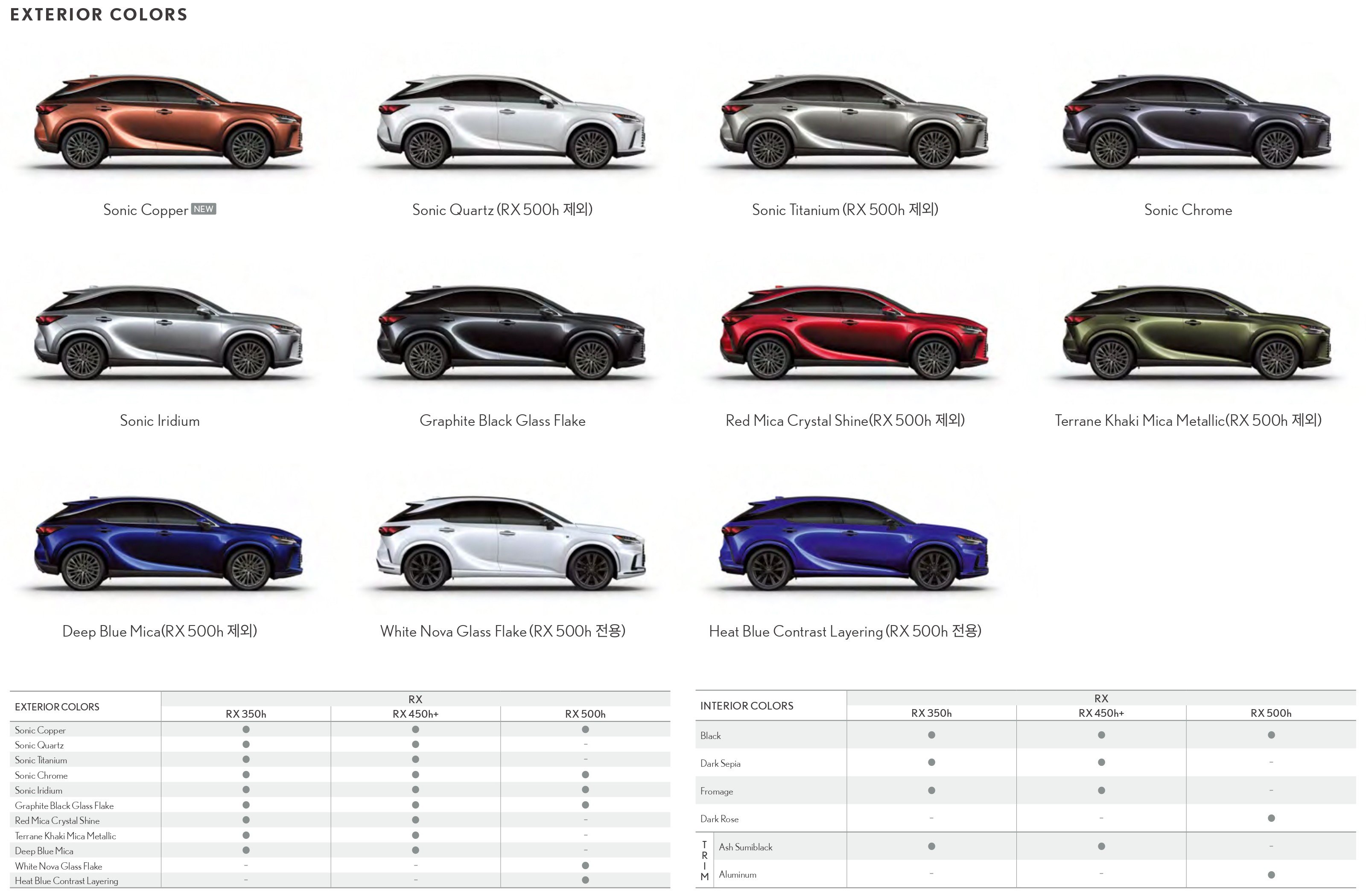 F스포츠가 적용된 RX500h의 전용 색상(2가지)도 있고, 반대로 선택이 불가능한 색상도 있습니다.