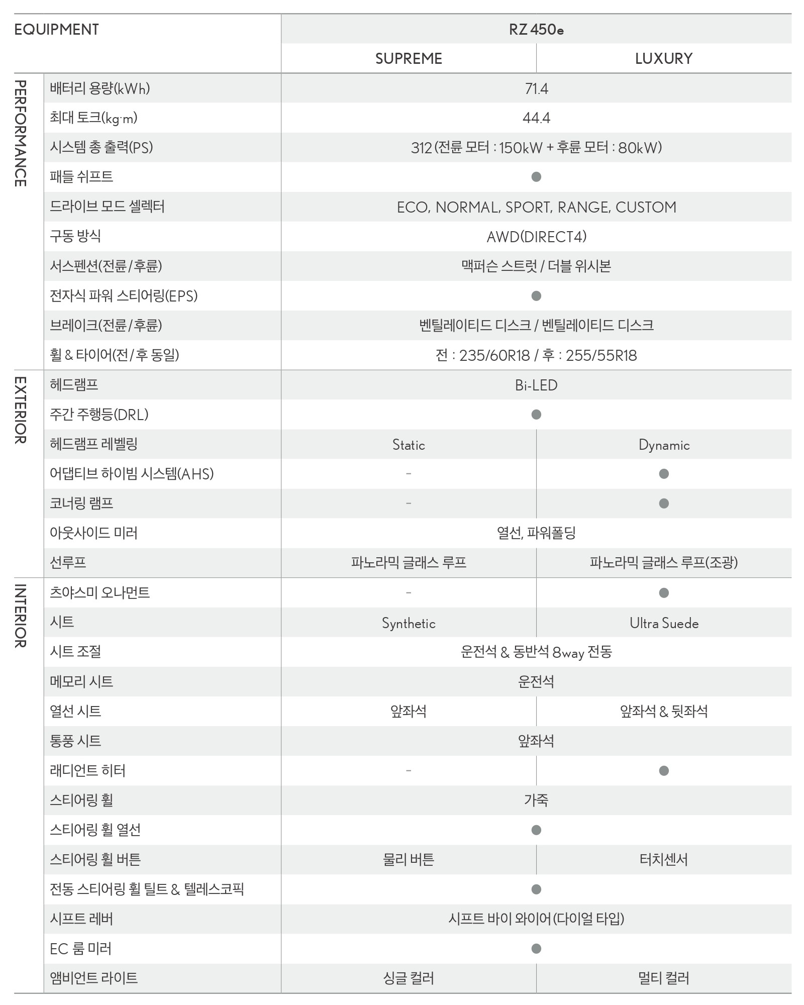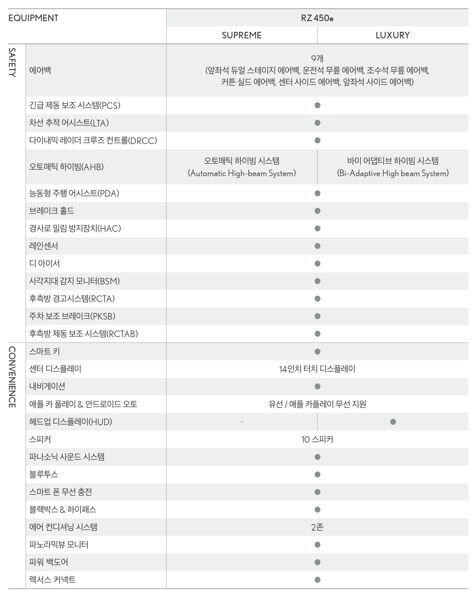 그렇다면, RZ450e 슈프림 및 럭셔리 두 트림 사이의 옵션 차이는 어떤지 한 번 살펴보실까요?