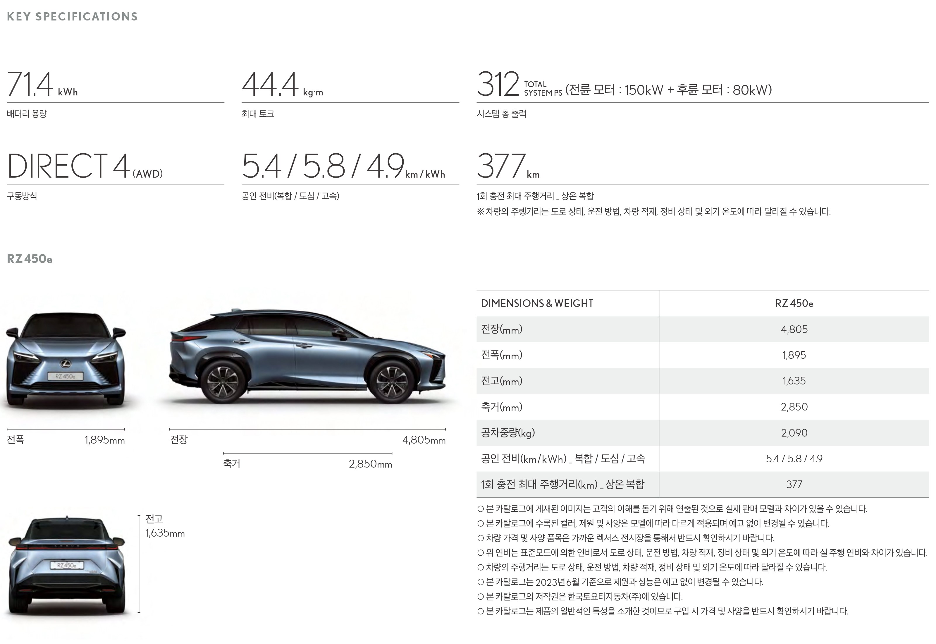 마지막으로 렉서스 RZ450e 의 제원(스펙) 입니다.