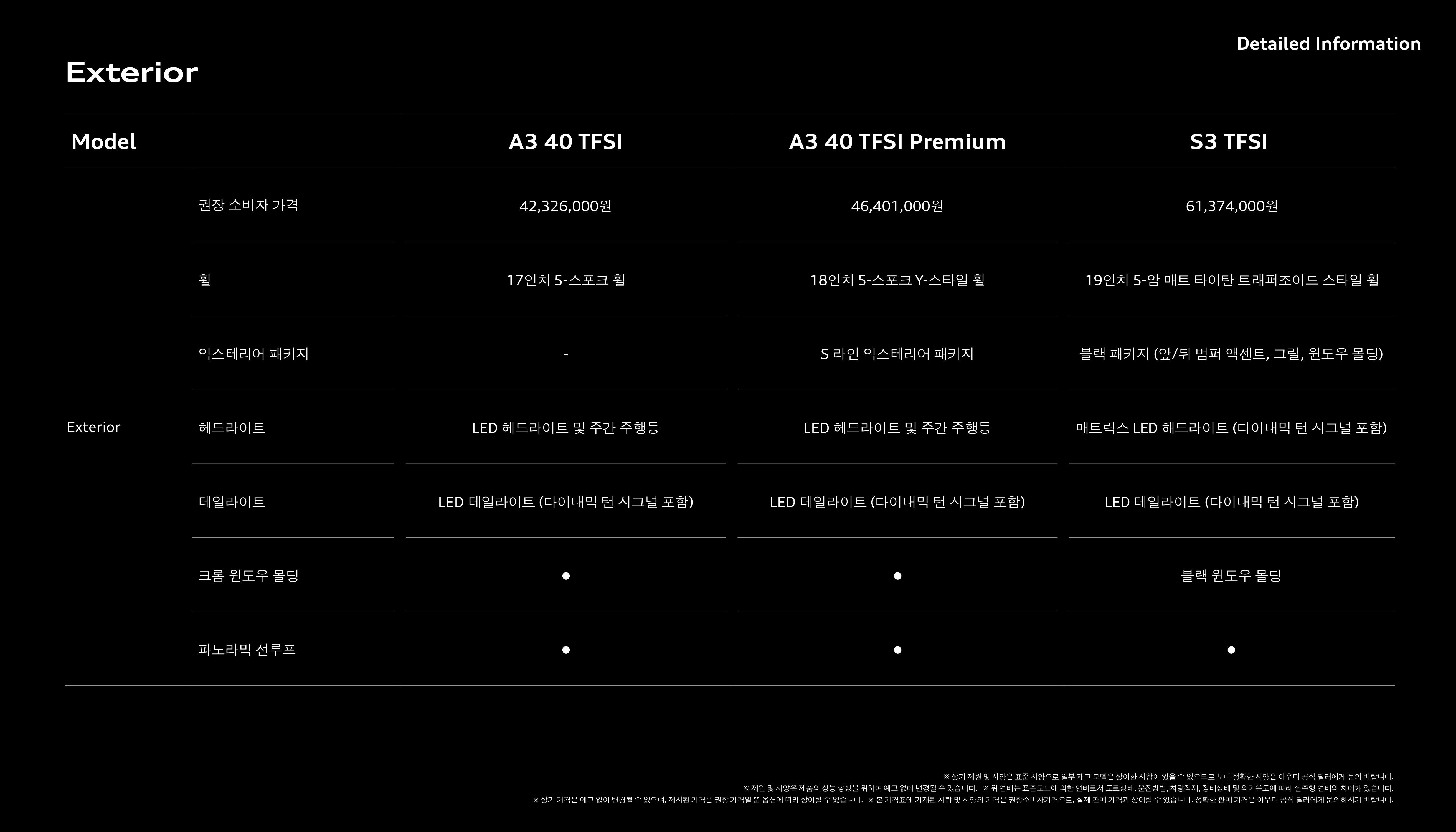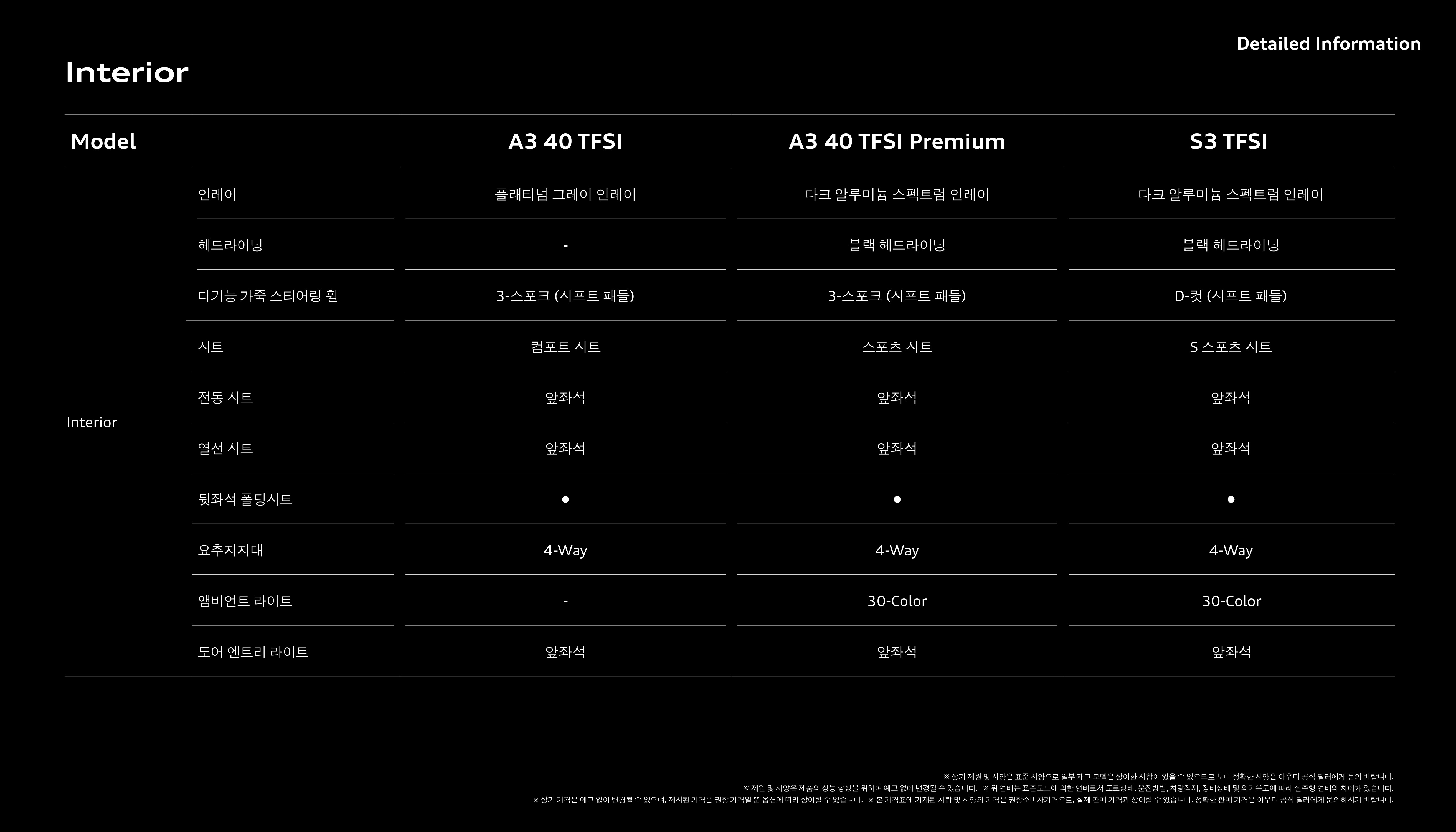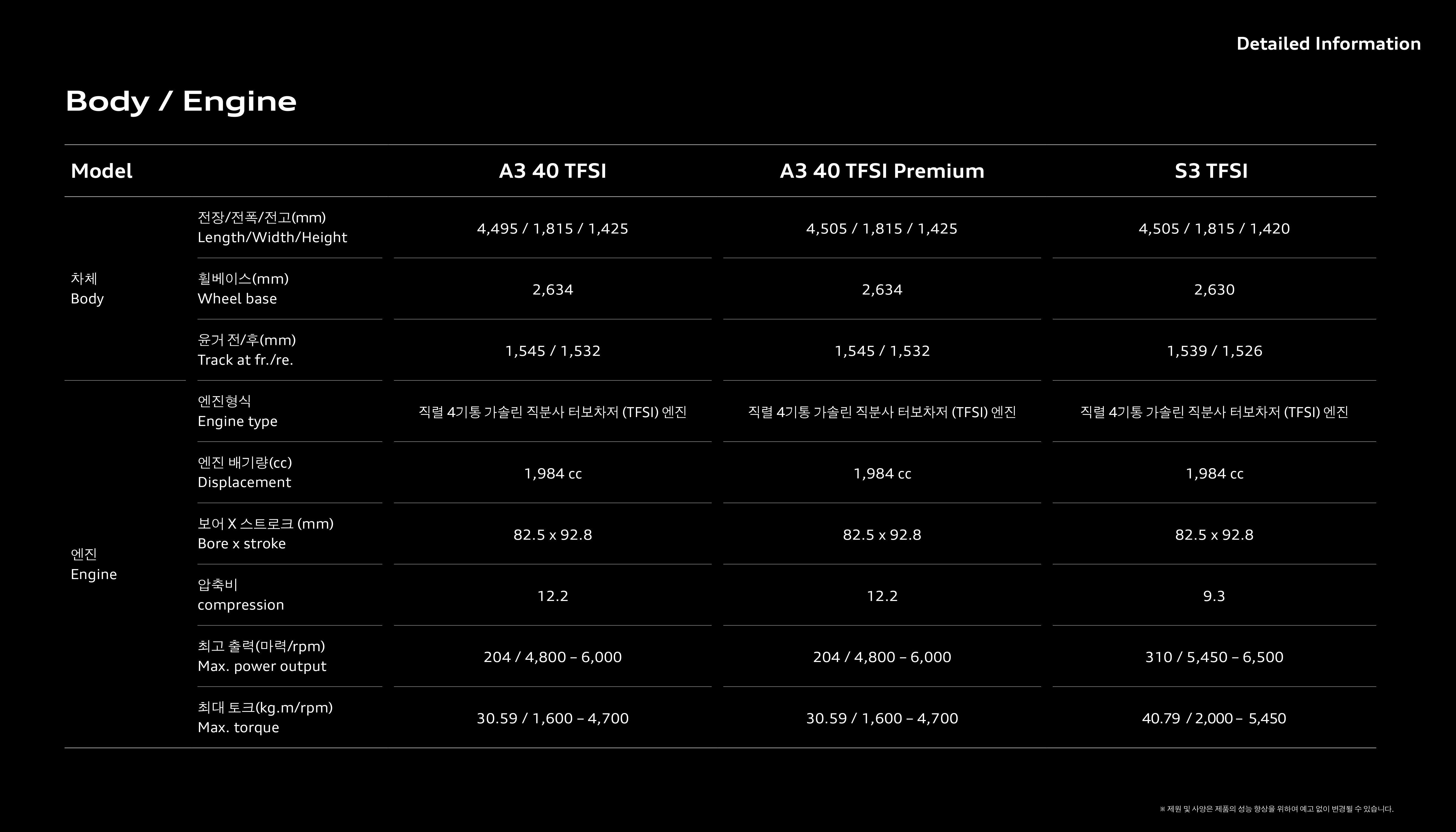 다음은 A3 및 S3 각 모델간의 제원입니다.