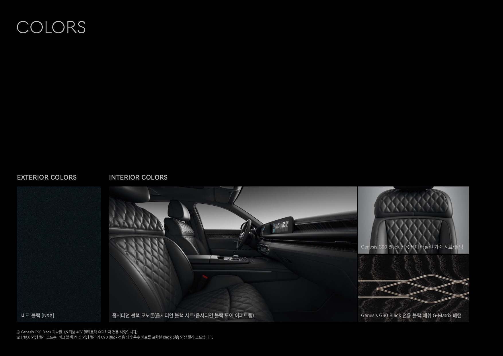 일반 G90에서 선택 가능한 비크 블랙의 외장과 옵시디언 블랙 모노톤의 내장 컬러를 넘어서서, G90 블랙만의 마감을 곳곳에 남겨둔 것이 특징입니다.
