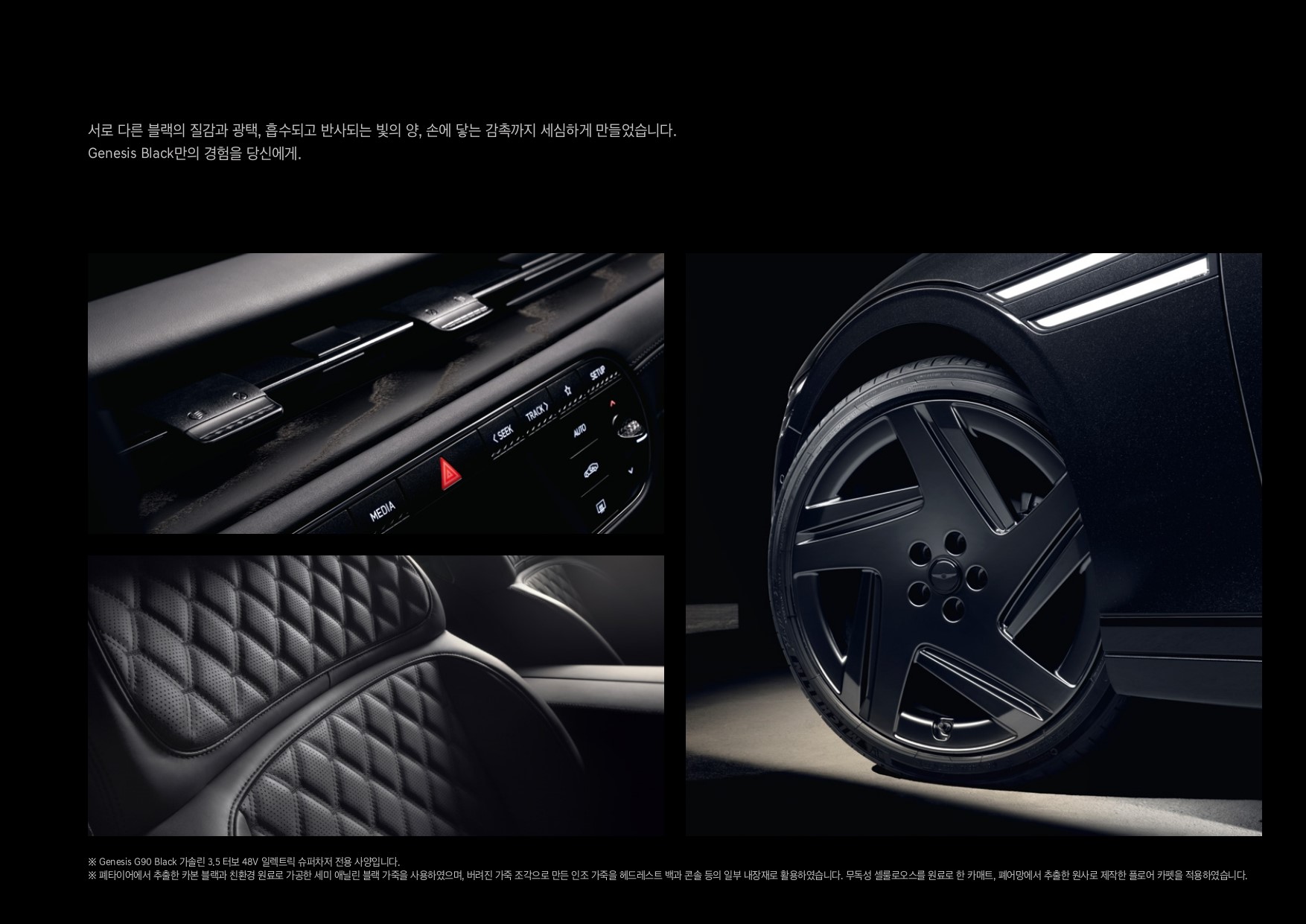 G90 블랙은 그 이름에서 알 수 있듯이, 외장 및 내부를 모두 블랙으로 꾸민 것은 물론이고, 소비자가 체감할 수 있는 모든 곳에 블랙으로 마감을 하였습니다.