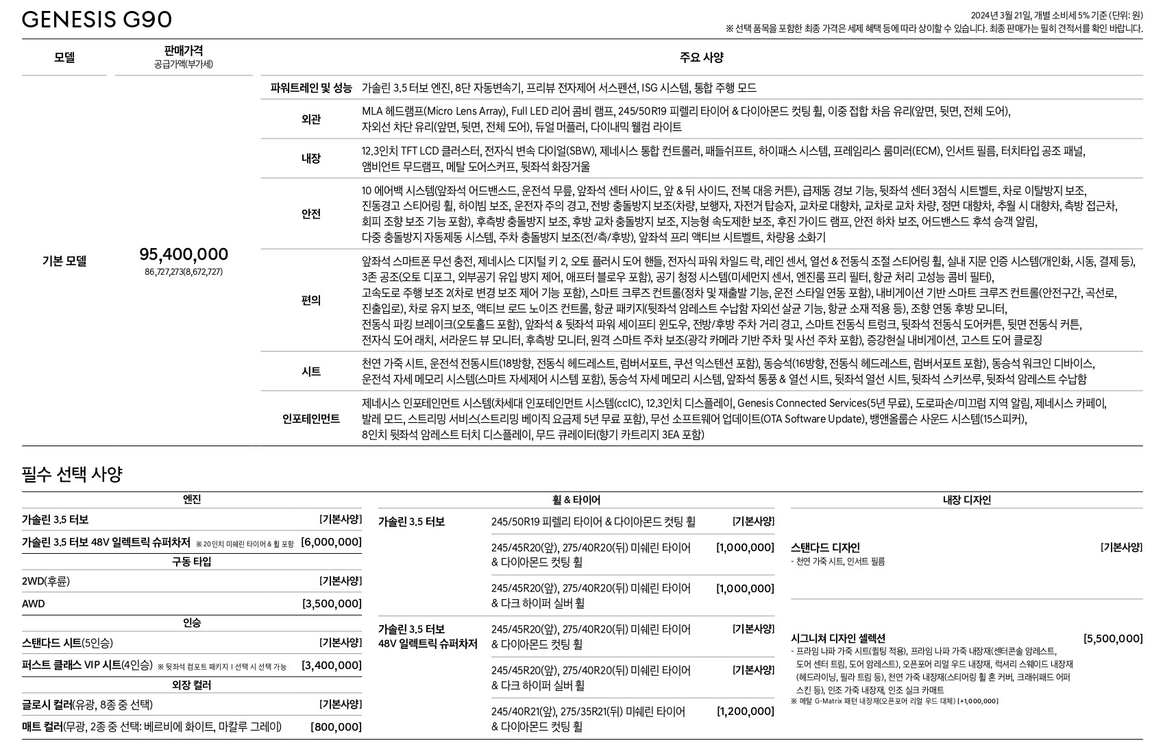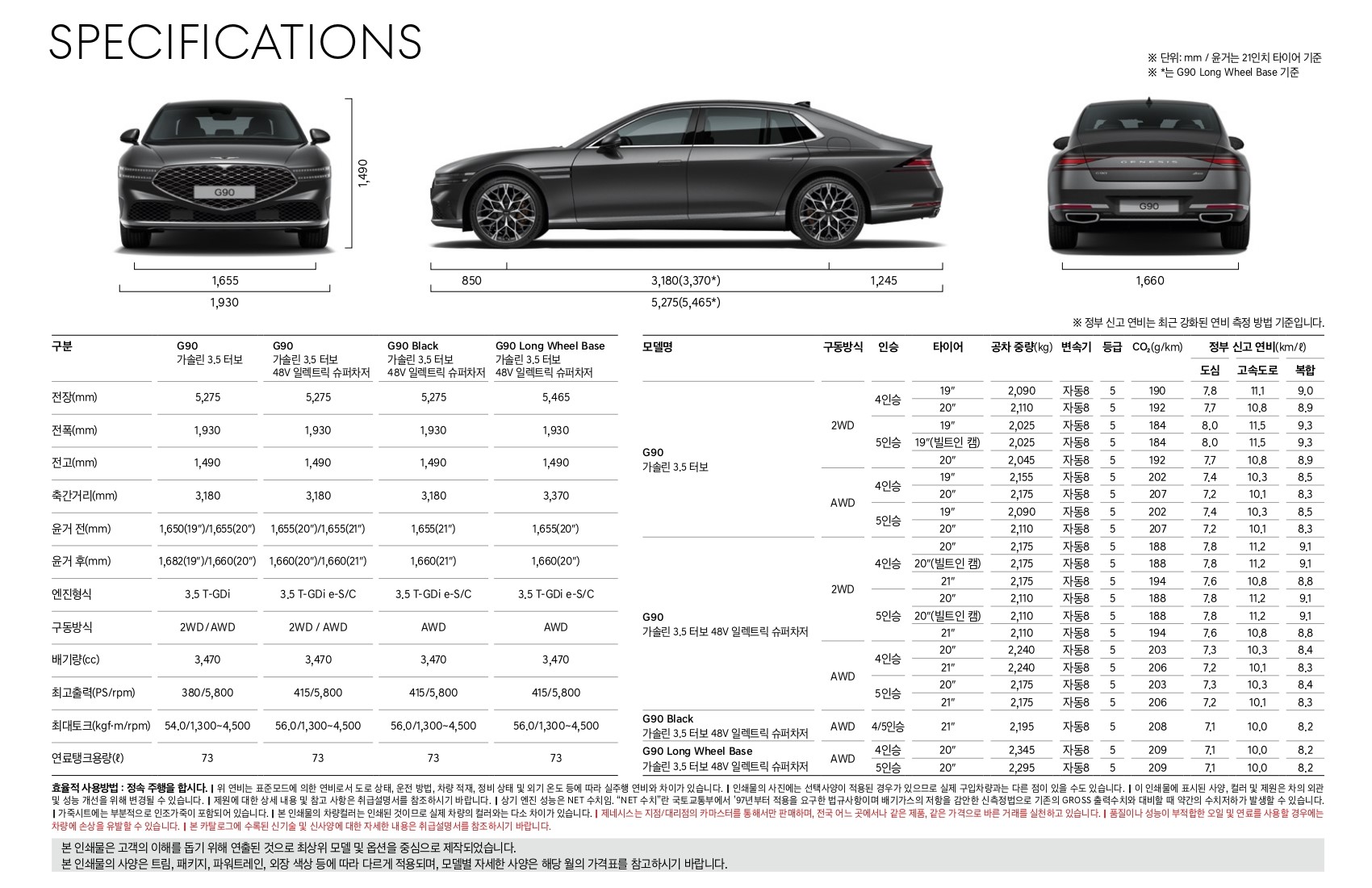 크기가 나온김에, G90의 제원(사양) 도 함 께 준비해 보았습니다.