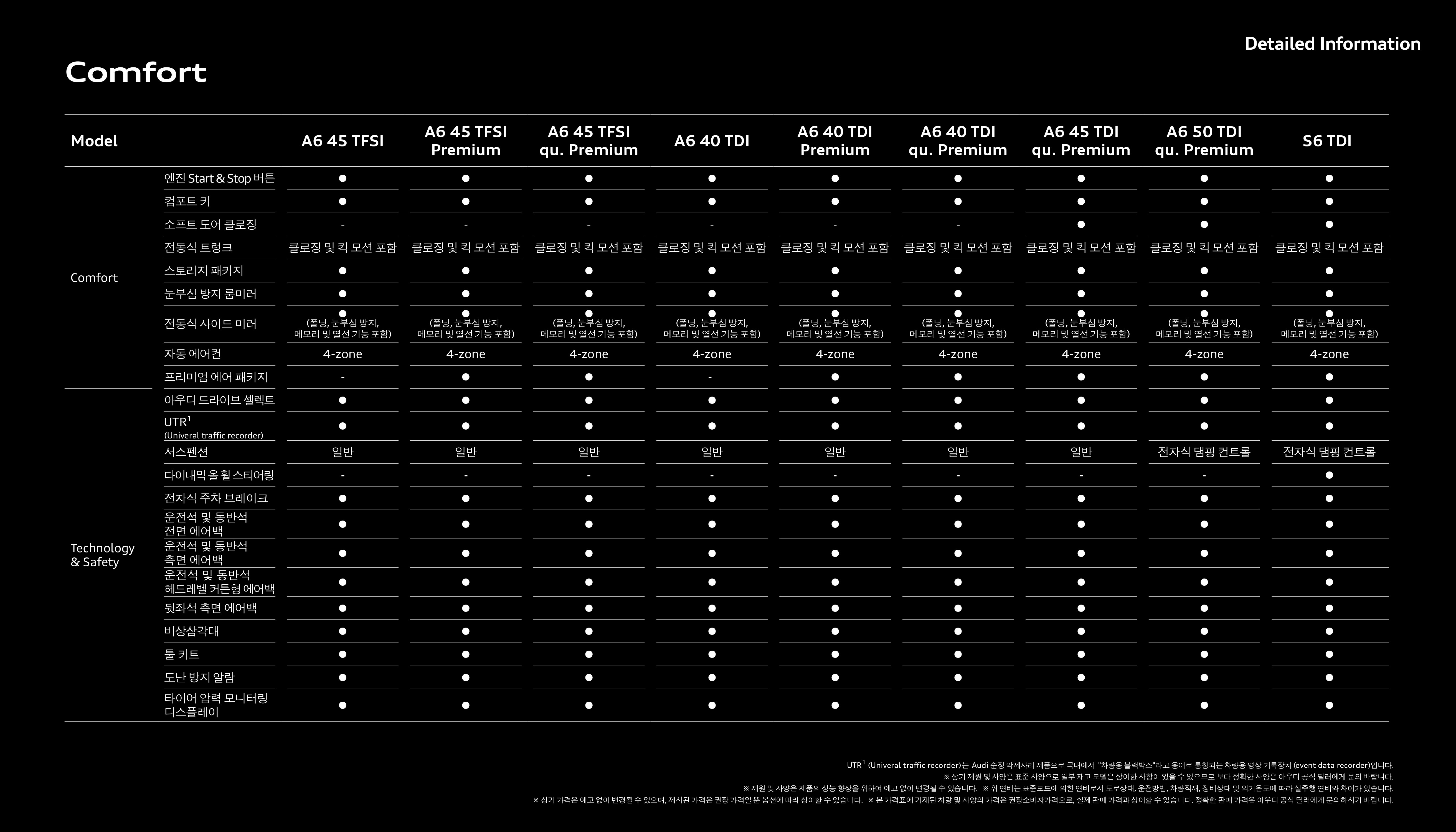 옵션표 내용을 정리해 보자면, 기본형 모델인 A6 45TFSI 및 A6 40TDI는 피하시는 게 좋습니다.