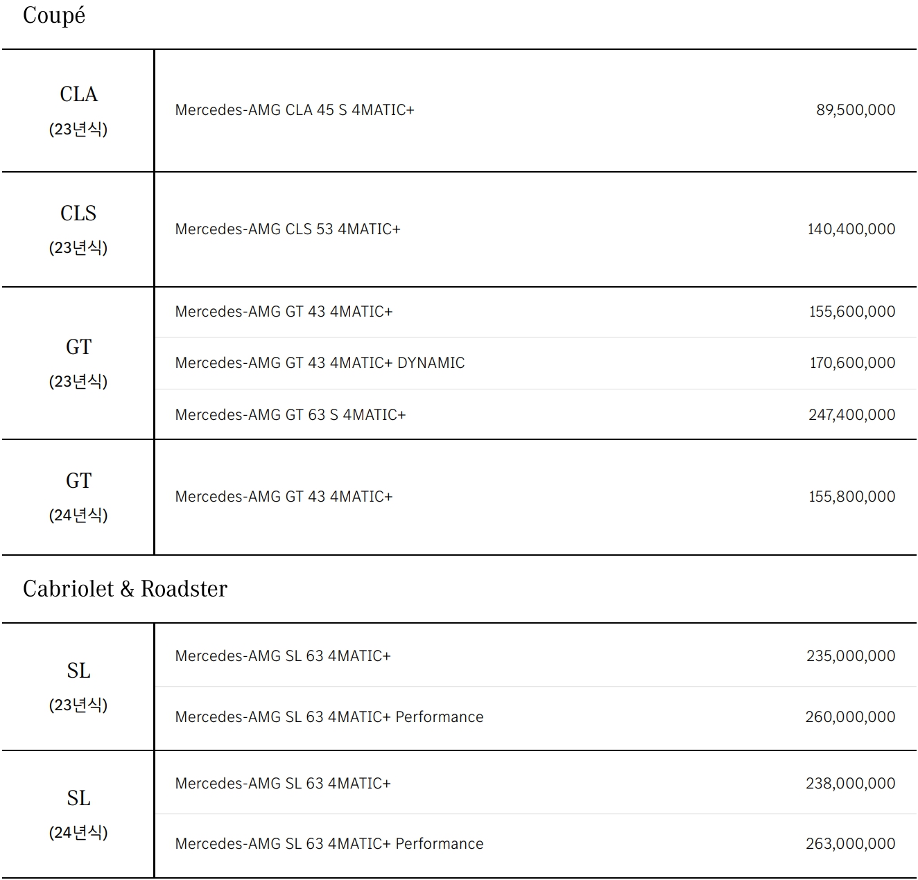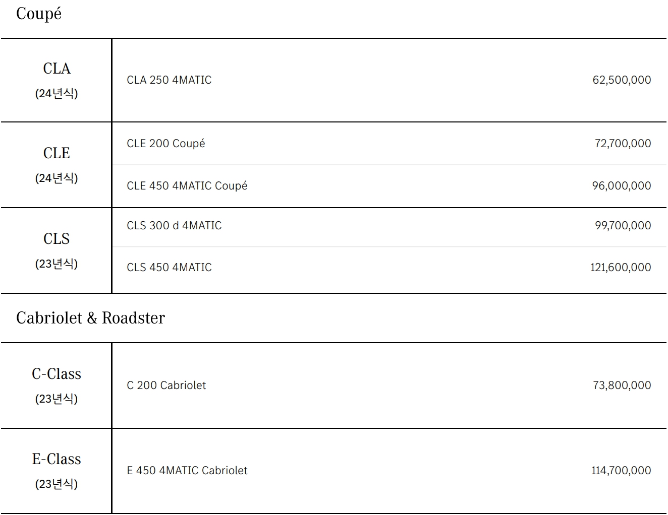 C클래스 및 E클래스 쿠페와 카브리올레를 통합하는 CLE 의 등장으로 인해, 가격표에 가장 많은 변화가 생겼습니다.